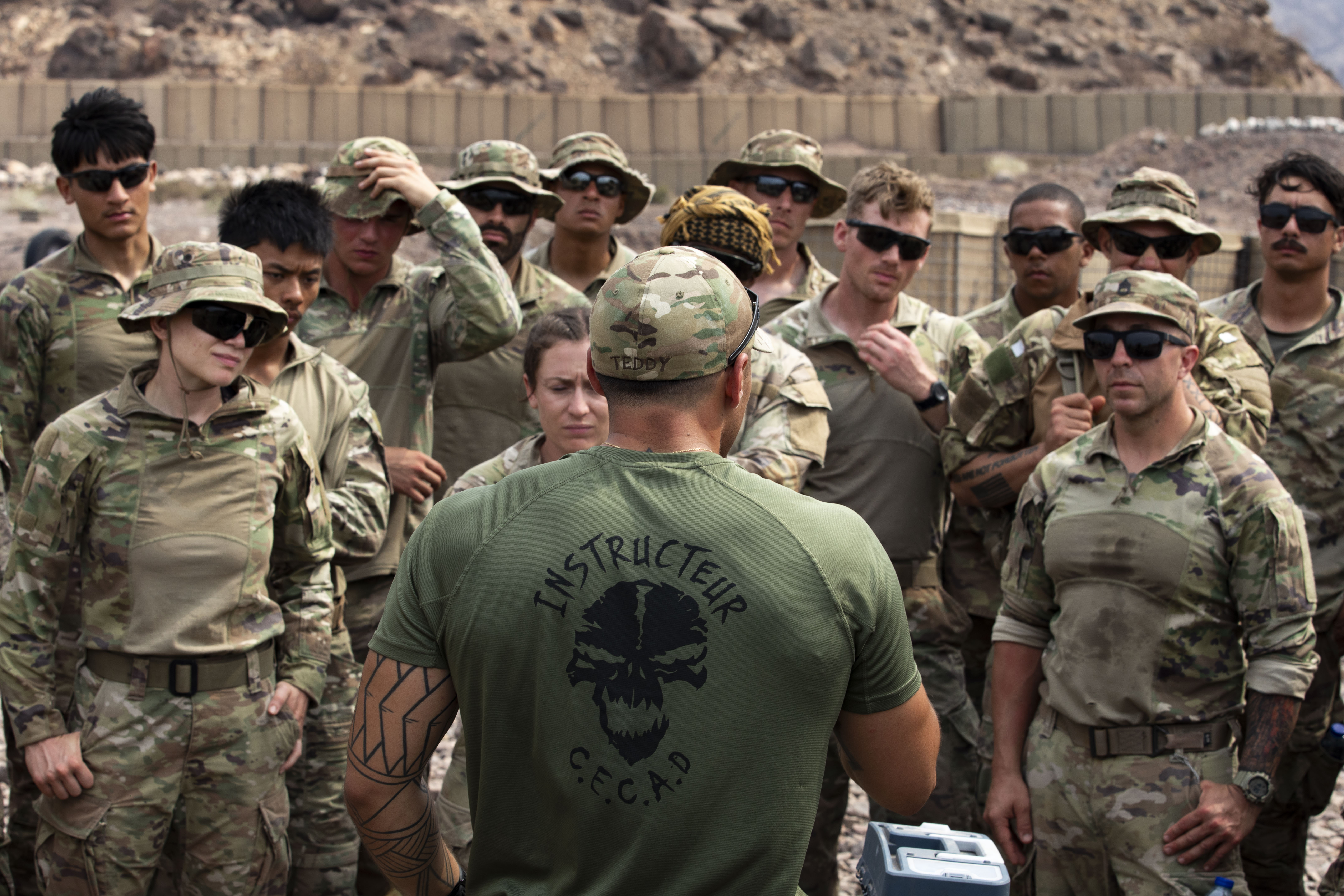 U.S. service members lead a tabletop discussion during the French Desert Commando Course at the Combat Training Center, Arta Beach, Djibouti March 19, 2025. The operation consisted of the platoon breaking down into four separate squads and demonstrating drills in a simulated battle environment. (U.S. Army photo by Spc. Micheala Maldonado)