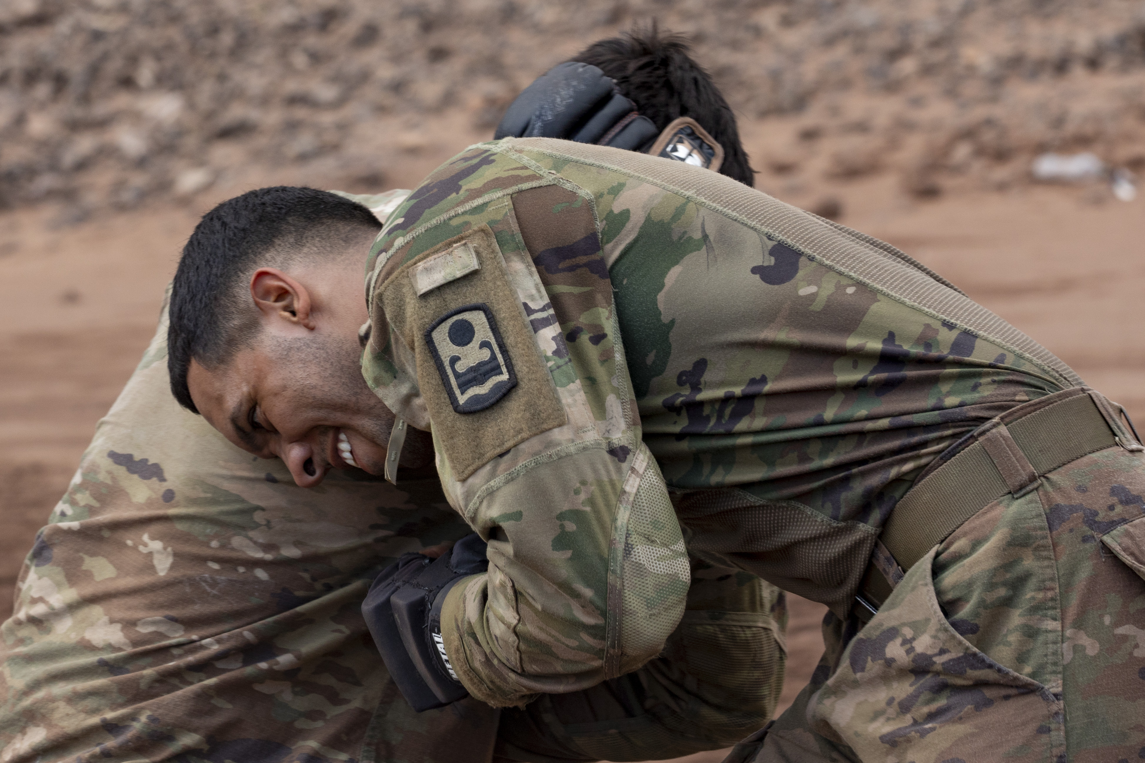 U.S. service members finish a hand-to-hand combat portion during the French Desert Commando Course at the Combat Training Center, Arta Beach, Djibouti March 19, 2025. This training assisted service members in ensuring that they are always ready, lethal and prepared for any range of hand-to-hand combat scenarios. (U.S. Army photo by Spc. Micheala Maldonado)