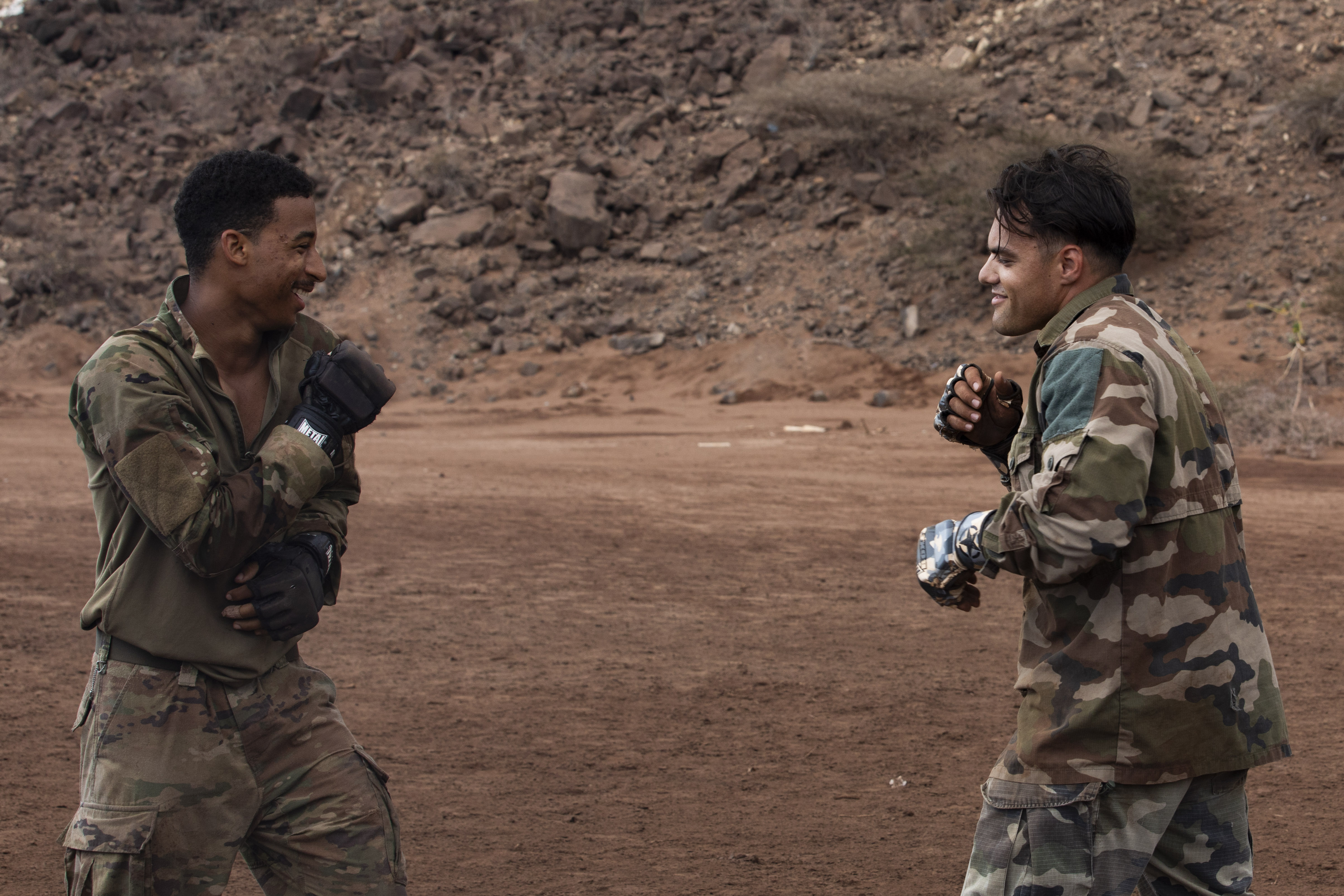U.S. service members spar during the French Desert Commando Course at the Combat Training Center, Arta Beach, Djibouti March 19, 2025. This training assisted service members in ensuring that they are always ready, lethal and prepared for any range of hand-to-hand combat scenarios. (U.S. Army photo by Spc. Micheala Maldonado)