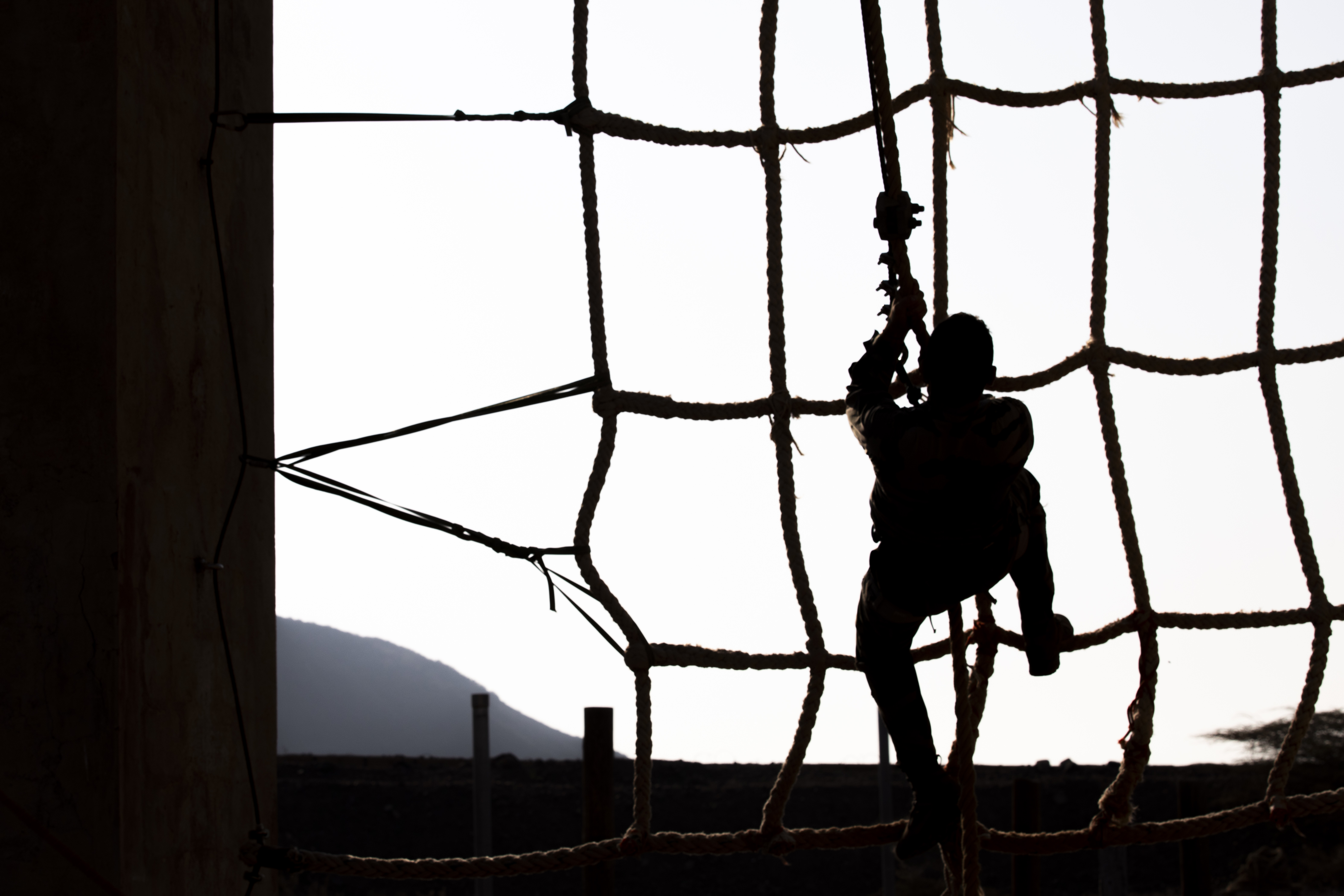 A French Desert Commando Course instructor demonstrates how to complete a rope swing during the mountain course portion of the FDCC at the Combat Training Center, Arta Beach, Djibouti March 16, 2025. Founded in Djibouti by the French army, the FDCC became a routine training requirement for French soldiers stationed in Djibouti. The French army’s 5th Overseas Interarms Regiment hosts the course and has invited U.S. personnel stationed in Djibouti to participate since 2015. (U.S. Army photo by Spc. Micheala Maldonado)