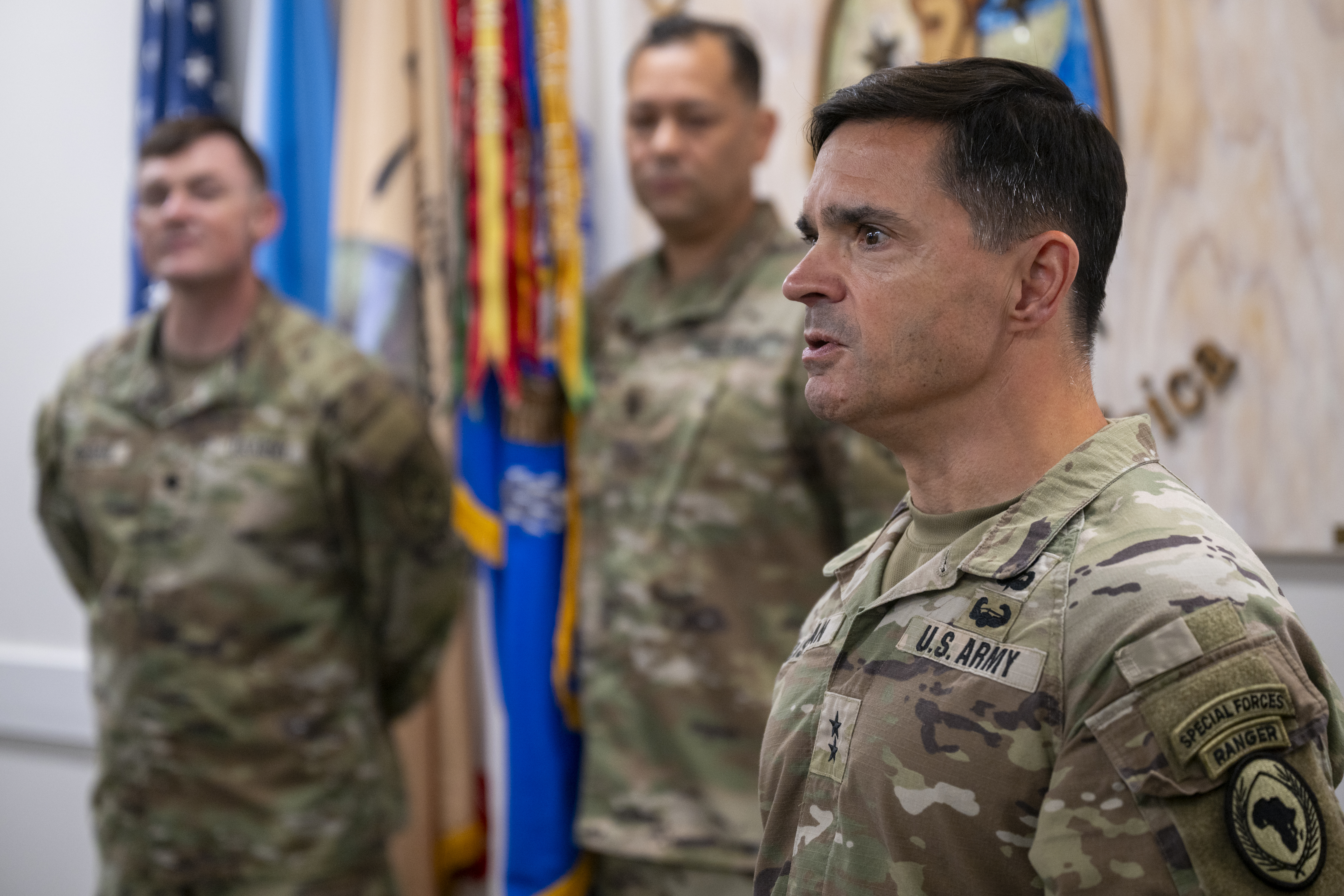 U.S. Army Lt. Col. Andrew Morgan, left, incoming 1st Battalion, 58th Aviation Regiment commander, stands by during the 1-58th assumption of command ceremony at Camp Lemonnier, Djibouti, June 9, 2025. The 1-58th manages and maintains airspace in the Combined Joint Task Force - Horn of Africa area of responsibility, enabling tactical and strategic operations across East Africa. (U.S. Air Force photo by Airman 1st Class Alexander Vasquez)