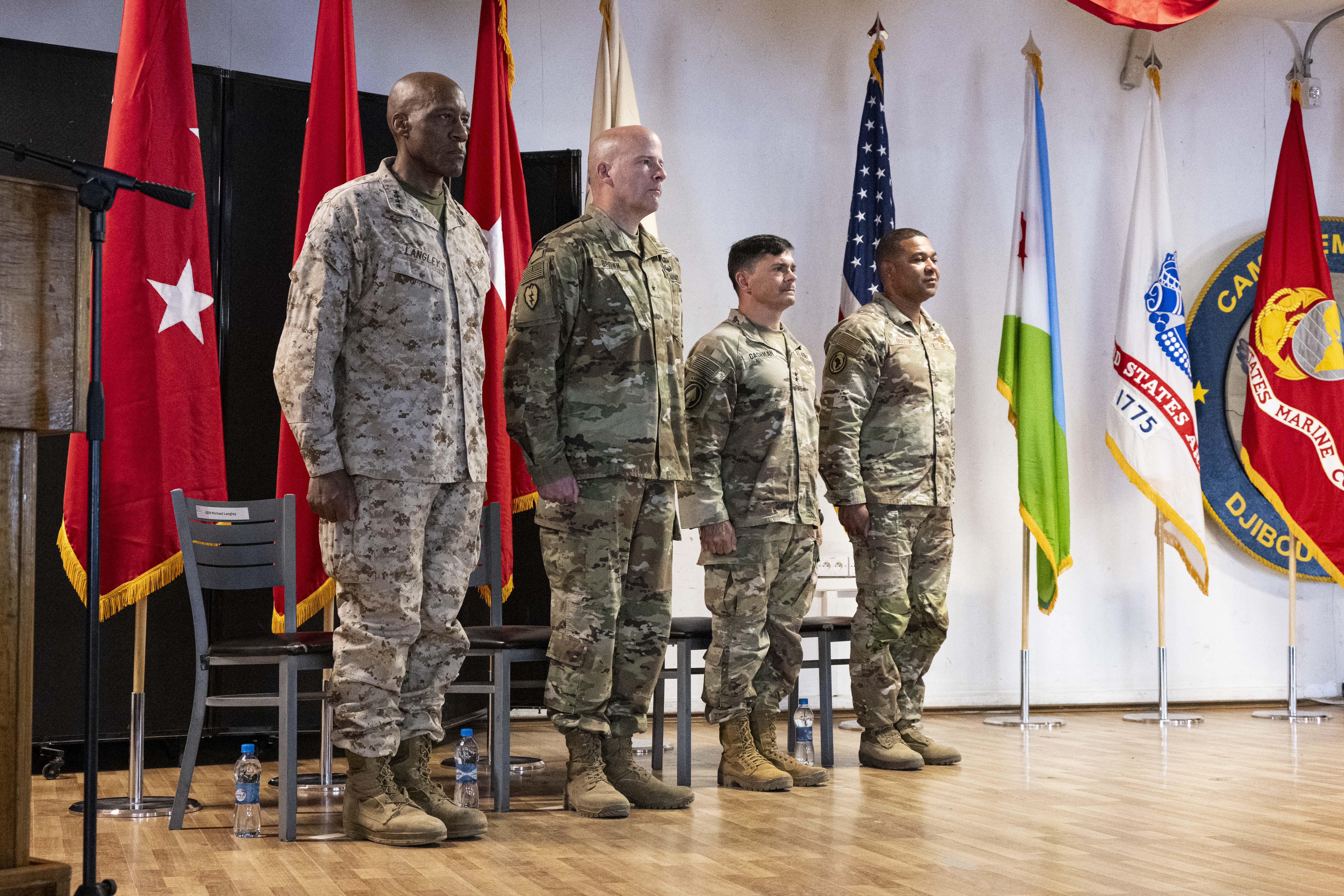 From left, U.S. Marine Corps Gen. Michael Langley, U.S. Africa Command commander, U.S. Army Brig. Gen. Matthew Brown, incoming Combined Joint Task Force - Horn of Africa commanding general, Army Maj. Gen. Brian Cashman, outgoing CJTF-HOA commanding general, and U.S. Air Force Chief Master Sgt. Ted Braxton Jr, CJTF-HOA command senior enlisted leader, stand at the position of attention during the Armed Forces Medley during the CJTF-HOA change-of-command ceremony at Camp Lemonnier, Djibouti, June 19, 2025. CJTF-HOA is a dynamic, joint and multinational operational headquarters responsible for ensuring strategic partnerships, responding to crises and supporting operations throughout East Africa to enhance stability and prosperity. (U.S. Air Force photo by Senior Airman Joseph Bartoszek)