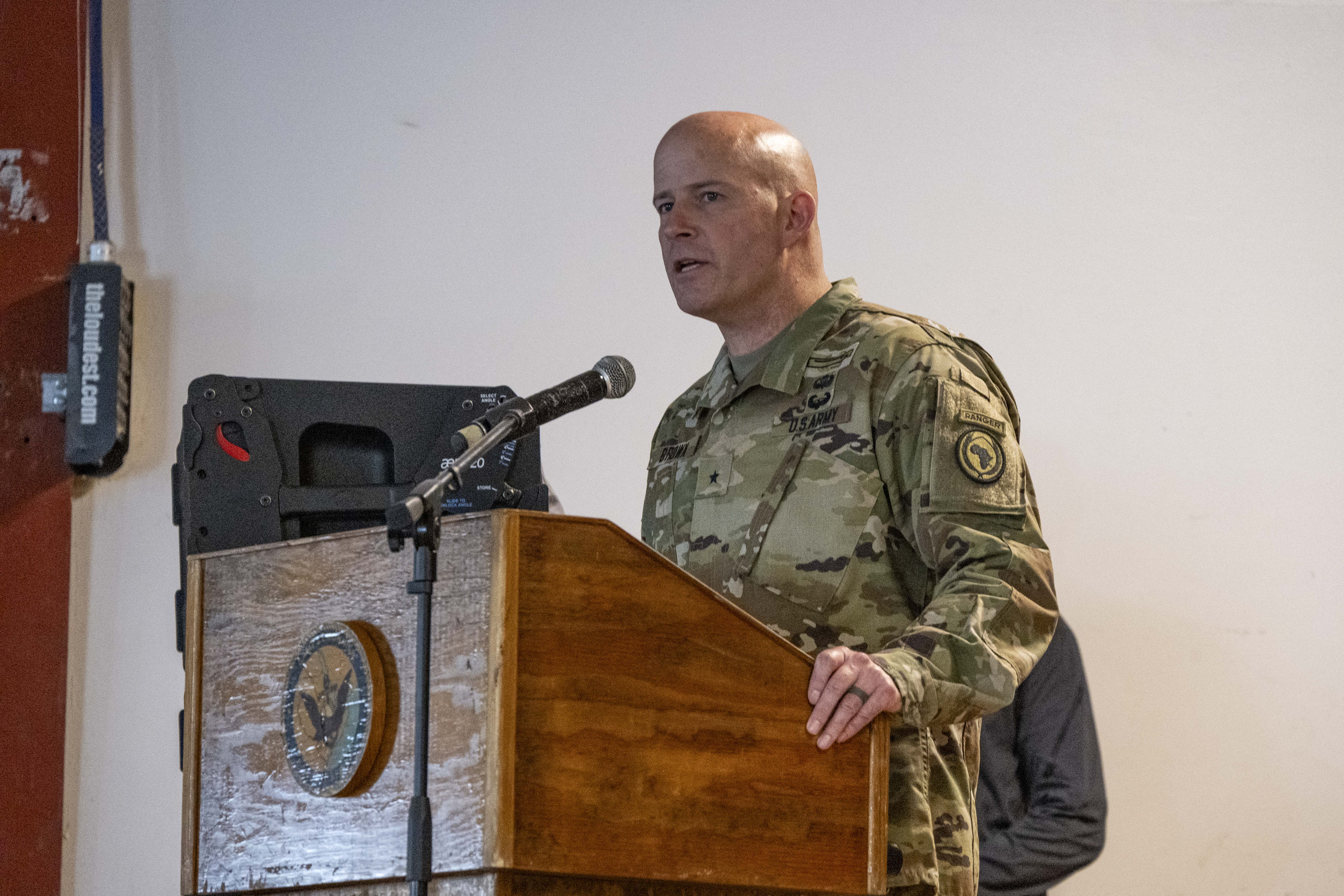 U.S. Army Maj. Gen. Brian T. Cashman, outgoing Combined Joint Task Force - Horn of Africa commanding general, delivers a speech during the CJTF-HOA change of command ceremony at Camp Lemonnier, Djibouti, June 19, 2025. CJTF-HOA is a dynamic, joint and multinational operational headquarters responsible for ensuring strategic partnerships, responding to crises and supporting operations throughout East Africa to enhance stability and prosperity. (U.S. Air Force photo by Senior Airman Joseph Bartoszek)