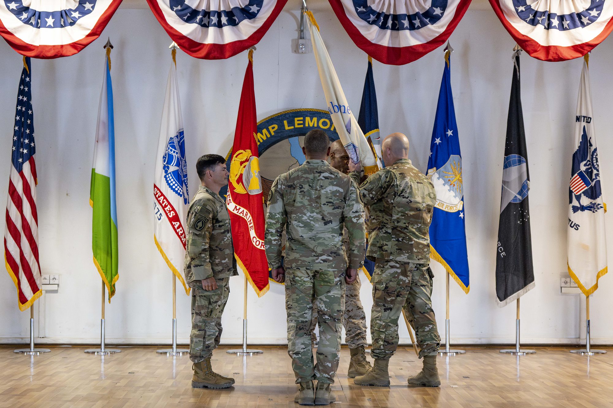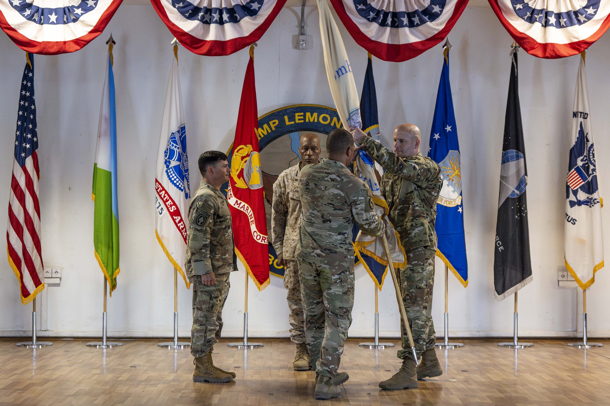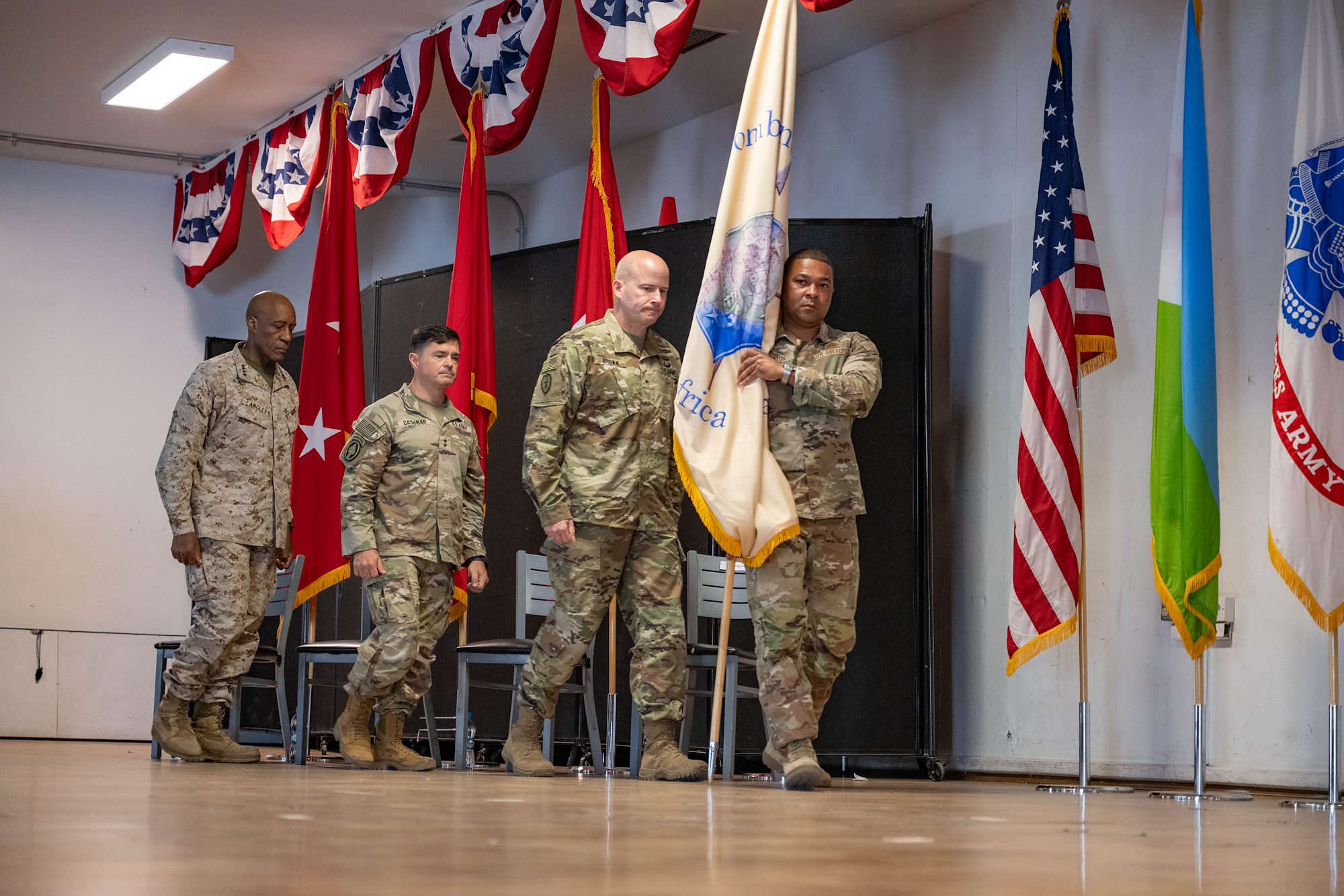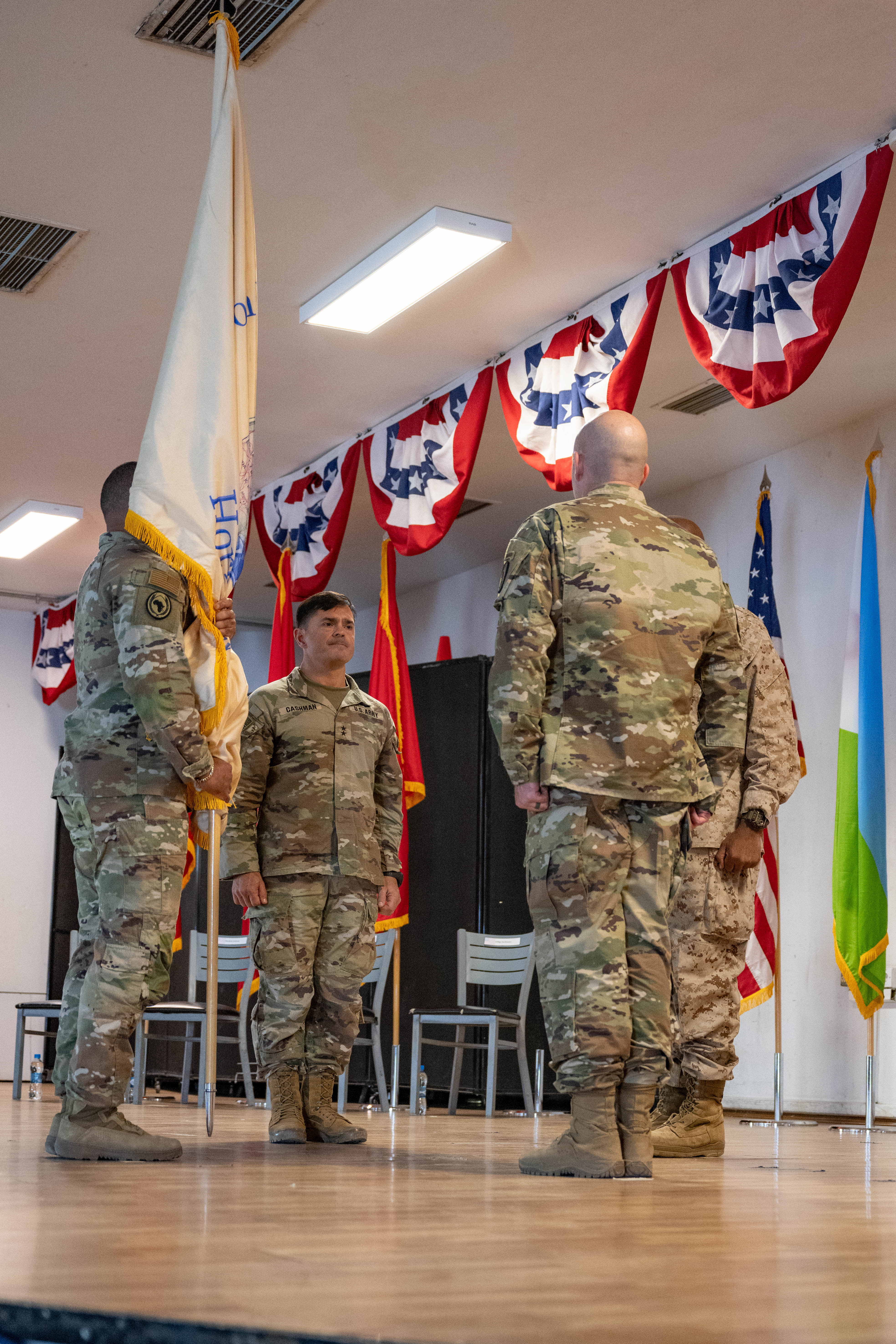 Prior to passing the guidon, Langley spoke of Cashman’s achievements during his time commanding CJTF-HOA, recognizing the impact Cashman has had on the people and mission during his 14 months in charge.