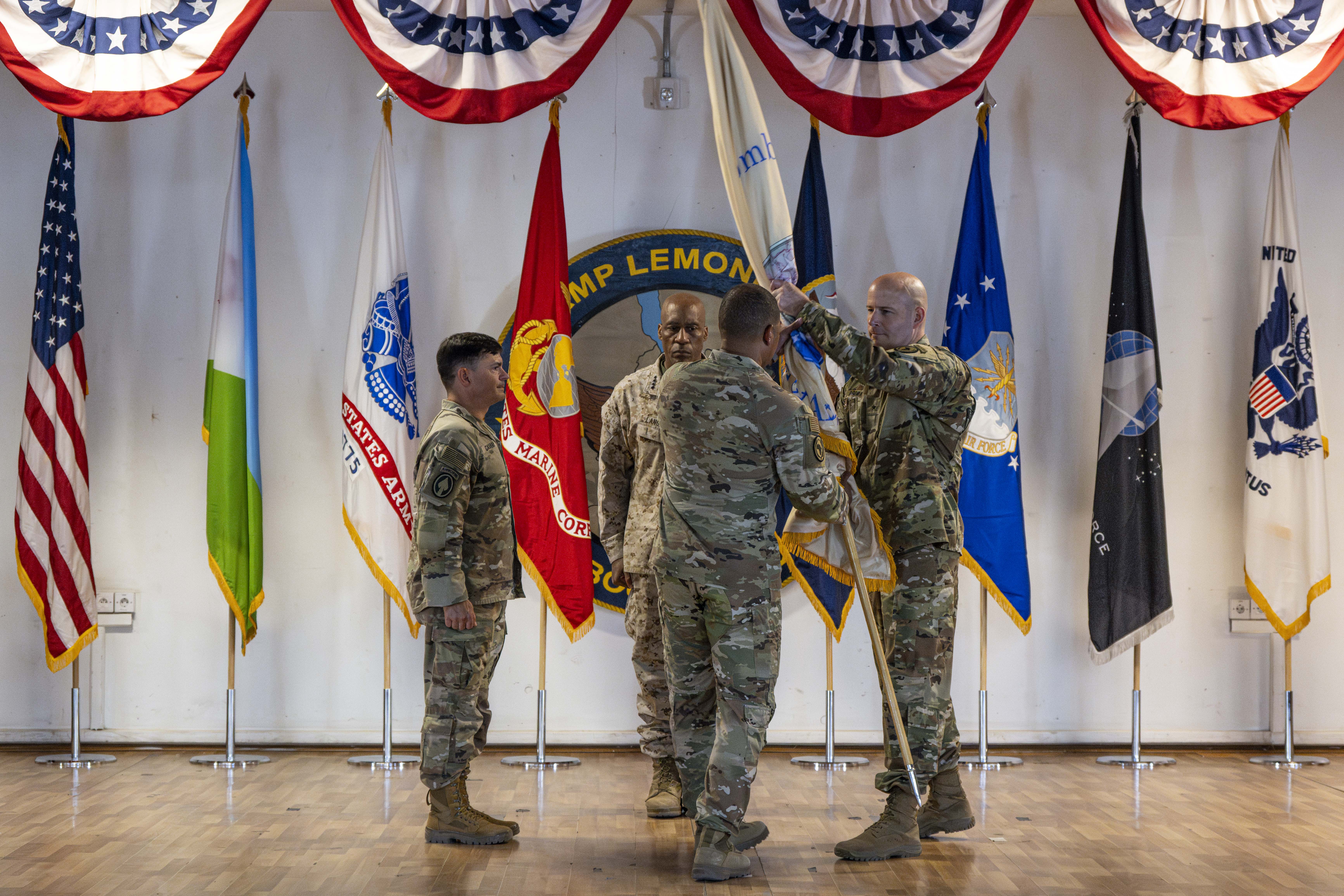 U.S. Marine Corps Gen. Michael Langley, commander of U.S. Africa Command, passes the guidon to U.S. Army Brig. Gen. Matthew Brown, incoming Combined Joint Task Force - Horn of Africa commanding general, during the CJTF-HOA change-of-command ceremony at Camp Lemonnier, Djibouti, June 19, 2025. CJTF-HOA is a dynamic, joint and multinational operational headquarters responsible for ensuring strategic partnerships, responding to crises and supporting operations throughout East Africa to enhance stability and prosperity. (U.S. Air Force photo by Senior Airman Joseph Bartoszek)