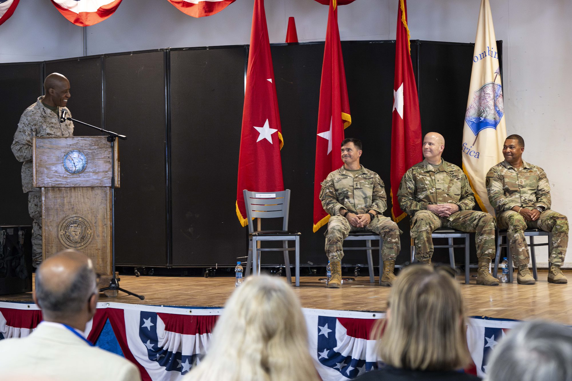 U.S. Marine Corps Gen. Michael Langley, commander of U.S. Africa Command, delivers a speech during the Combined Joint Task Force - Horn of Africa change-of-command ceremony at Camp Lemonnier, Djibouti, June 19, 2025. Composed of multiple U.S. military branches and coupled with foreign armed service personnel from various allied and partner nations, CJTF-HOA conducts operations to enhance partner nation capacity, promote regional stability, dissuade conflict and protect U.S. and partner interests. (U.S. Air Force photo by Senior Airman Joseph Bartoszek)