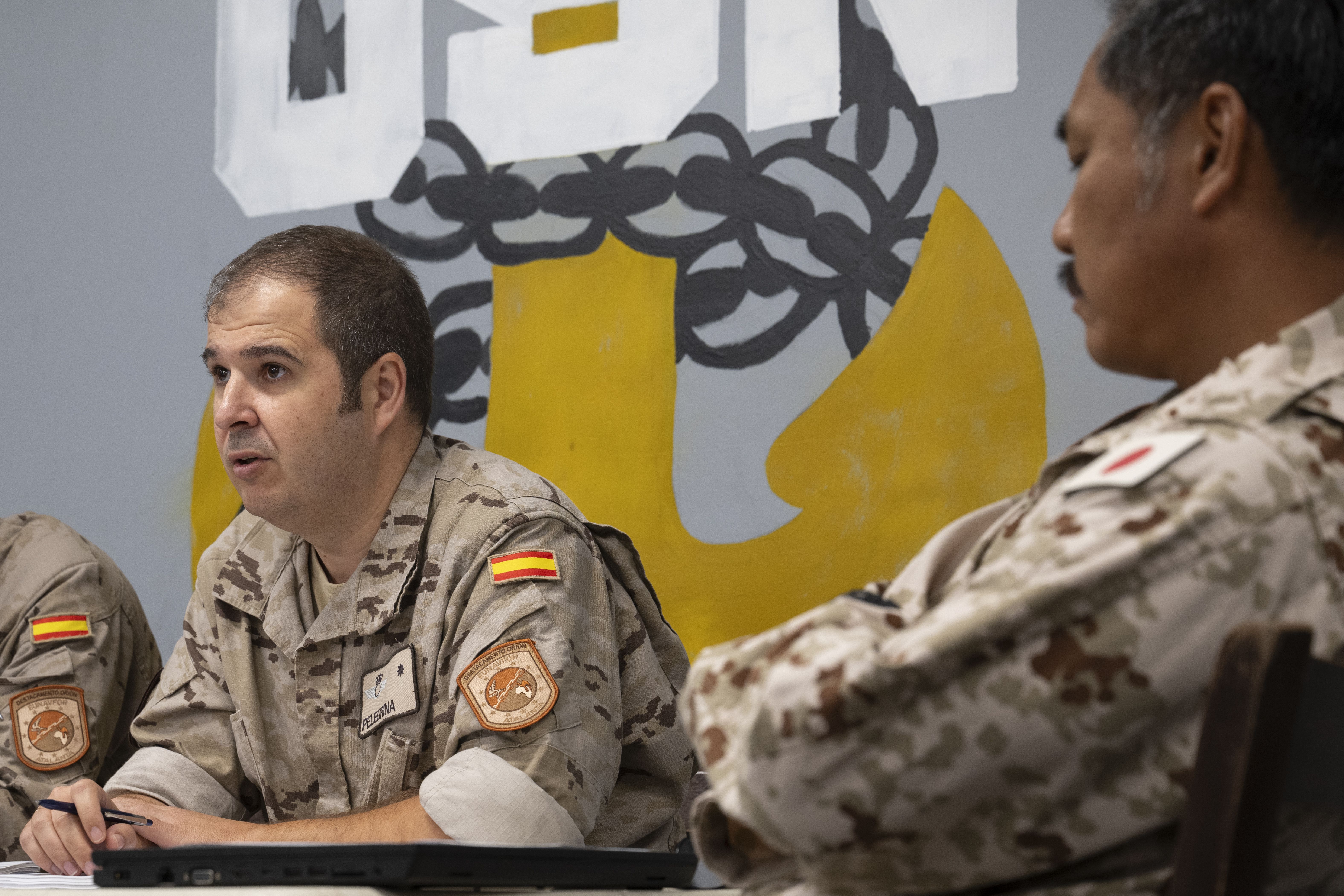 Spanish Air and Space Force Lt. Ricardo Coello, right, Air Tactical Detachment Orion public affairs officer, works together with Combined Joint Task Force - Horn of Africa U.S. service members and foreign liaison officers during a Multinational Coordination Cell tabletop exercise at Camp Lemonnier, Djibouti, June 24, 2025. The CJTF-HOA MNCC is a collaborative group of U.S. and partner force representatives designed to coordinate crisis response operations in the case of an event affecting the U.S. and partner nation personnel within the U.S. Africa Command area of responsibility. (U.S. Air Force photo by Staff Sgt. Marcus Hardy-Bannerman)
