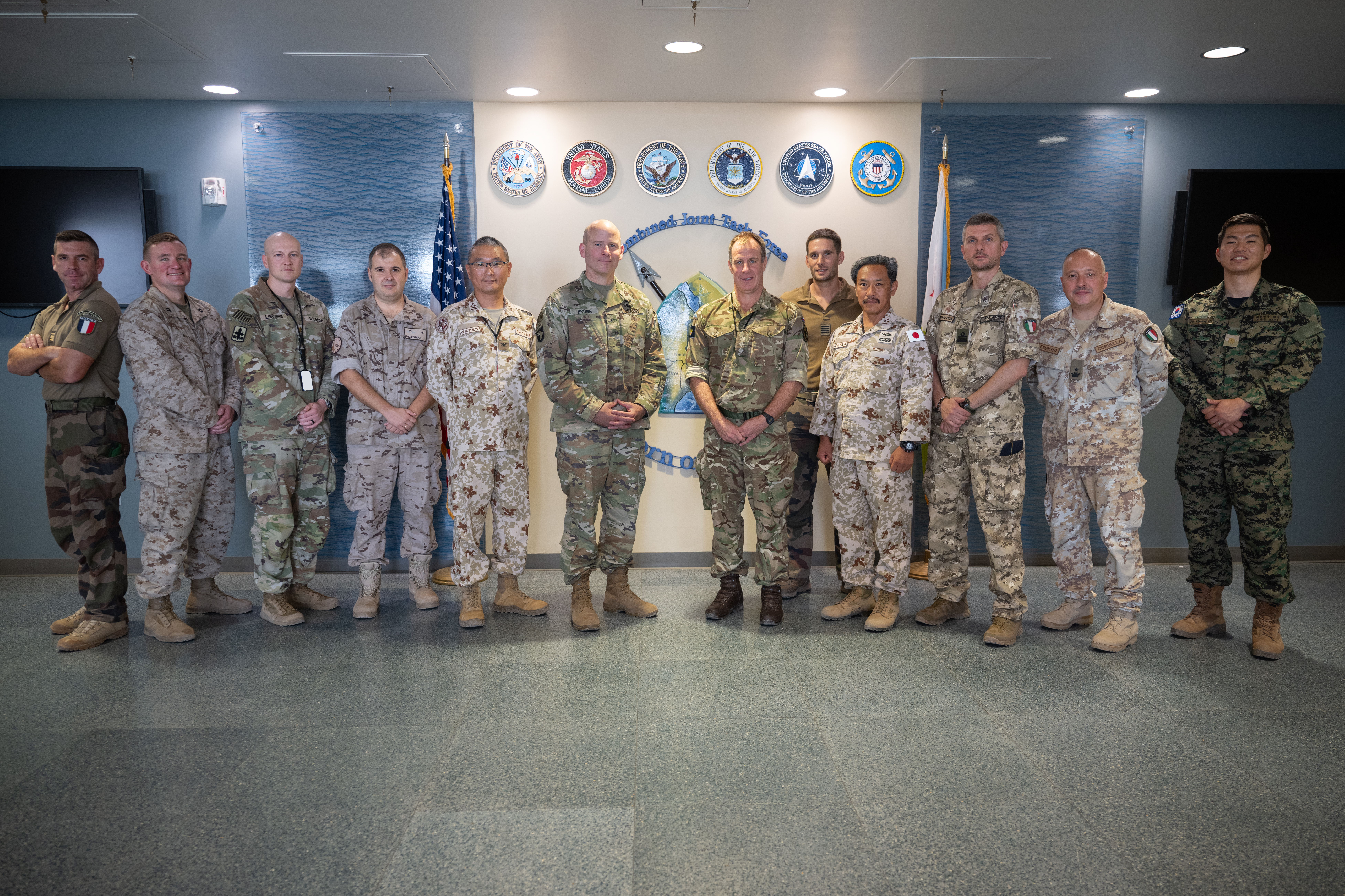 Combined Joint Task Force - Horn of Africa U.S. service members and partners from France, Italy, Japan, Spain and South Korea participate in a Multinational Coordination Cell tabletop exercise at Camp Lemonnier, Djibouti, June 24, 2025. The MNCC tabletop exercise tested participant crisis response capabilities to maintain readiness and increase interoperability in a crisis situation. (U.S. Air Force photo by Marcus Hardy-Bannerman)