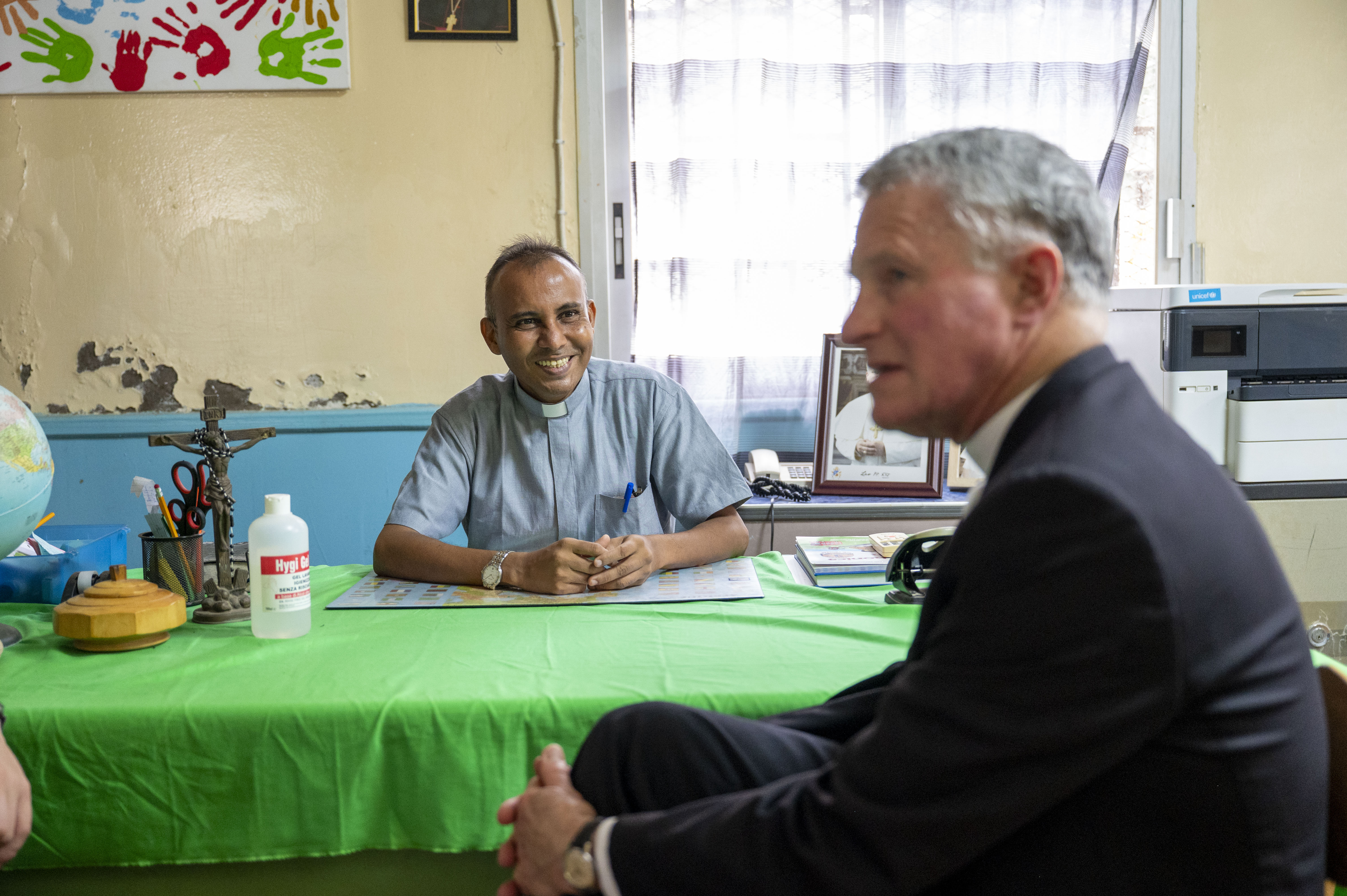 Archbishop Timothy P. Broglio, Archbishop of the Archdiocese for the U.S. Military Services, meets with Father Solomon Panneerselvam, director of Caritas, during his pastoral visit to Djibouti, Dec. 18, 2025. The visit highlighted how faith-based humanitarian organizations complement broader international efforts to support vulnerable populations and regional resilience. (U.S. Air Force photo by Senior Airman Michelle Ferrari)
