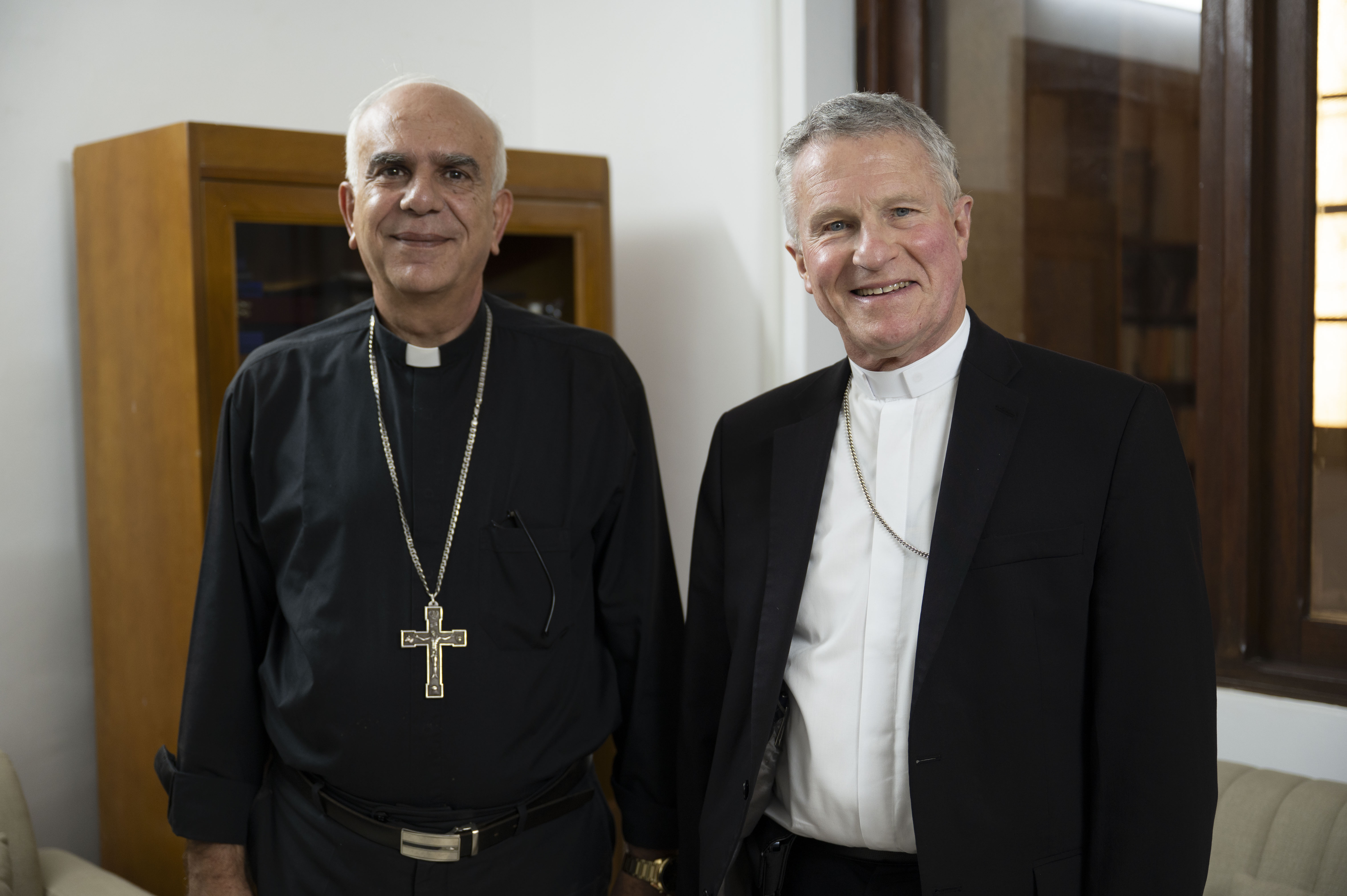 Bishop Jamal Daibes, Bishop of Djibouti, meets with Archbishop Timothy P. Broglio, Archbishop of the Archdiocese for the U.S. Military Services, during his pastoral visit to Djibouti, Dec. 18, 2025. The engagement supported enduring religious and community partnerships that contribute to stability, cooperation, and mutual understanding in the Horn of Africa. (U.S. Air Force photo by Senior Airman Michelle Ferrari)
