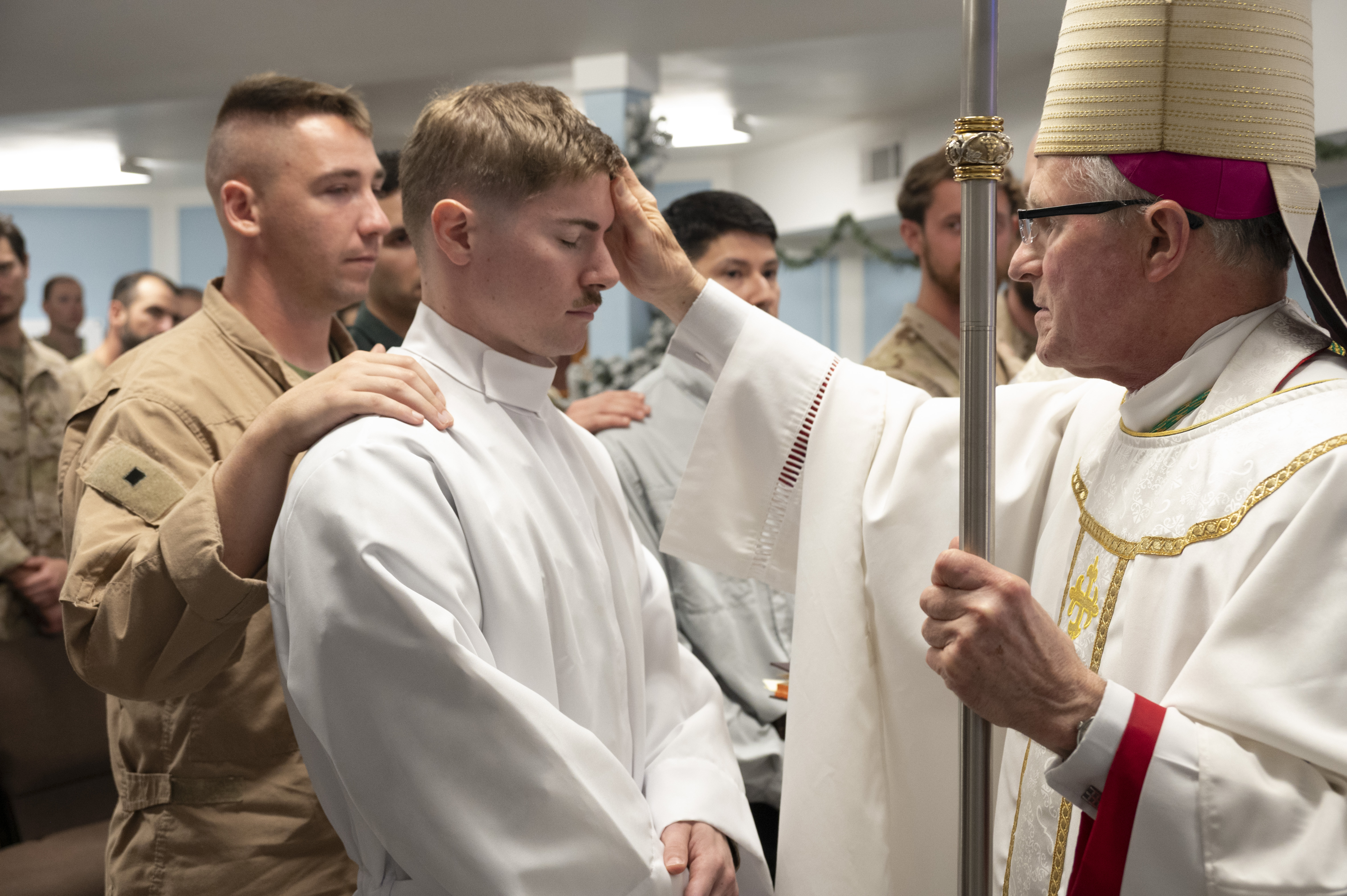 Archbishop Timothy P. Broglio, Archbishop of the Archdiocese for the U.S. Military Services, performs a Catholic baptism in the chapel at Camp Lemonnier, Djibouti, Dec. 19, 2025. The baptism highlighted continued religious support to deployed personnel as part of comprehensive force care. (U.S. Army photo by Sgt. 1st Class Kenneth Tucceri)