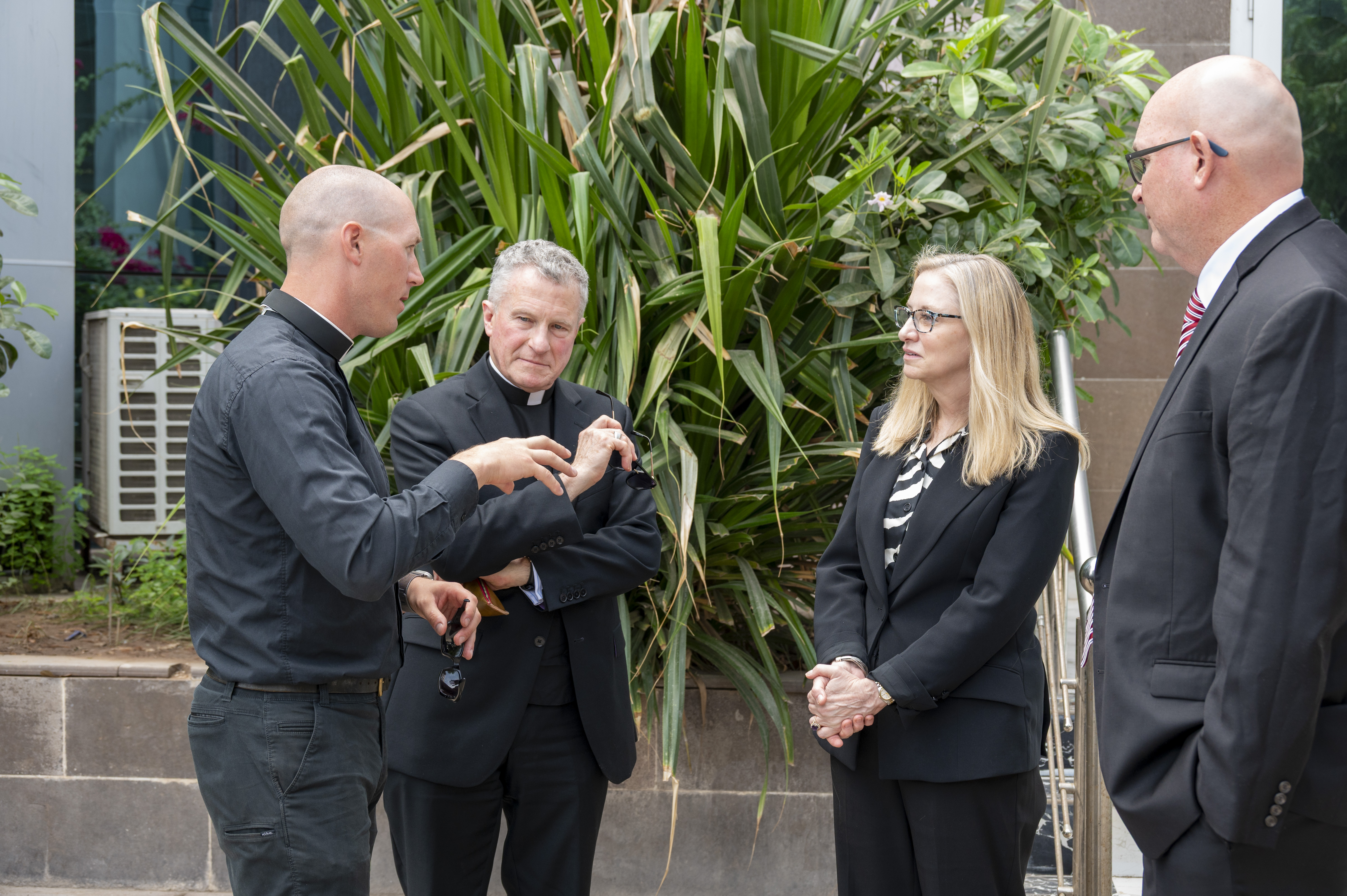 Archbishop Timothy P. Broglio, Archbishop of the Archdiocese for the U.S. Military Services, U.S. Ambassador Cynthia Kierscht, U.S. Ambassador to Djibouti, Army Maj. Christopher Zeigler, director of religious affairs, Joint Task Force - Horn of Africa, and U.S. Navy Lt. Cmdr. Father Samuel Schneider, Camp Lemonnier Navy chaplain, confer during the Archbishop’s pastoral visit to Djibouti, Dec. 17, 2025. Throughout the week, the Archbishop engaged with U.S. and Djiboutian religious, diplomatic and military leaders underscoring religious outreach as a complementary effort within broader U.S. initiatives to strengthen partnerships and security cooperation in East Africa. (U.S. Army photo by Sgt. 1st Class Kenneth Tucceri)