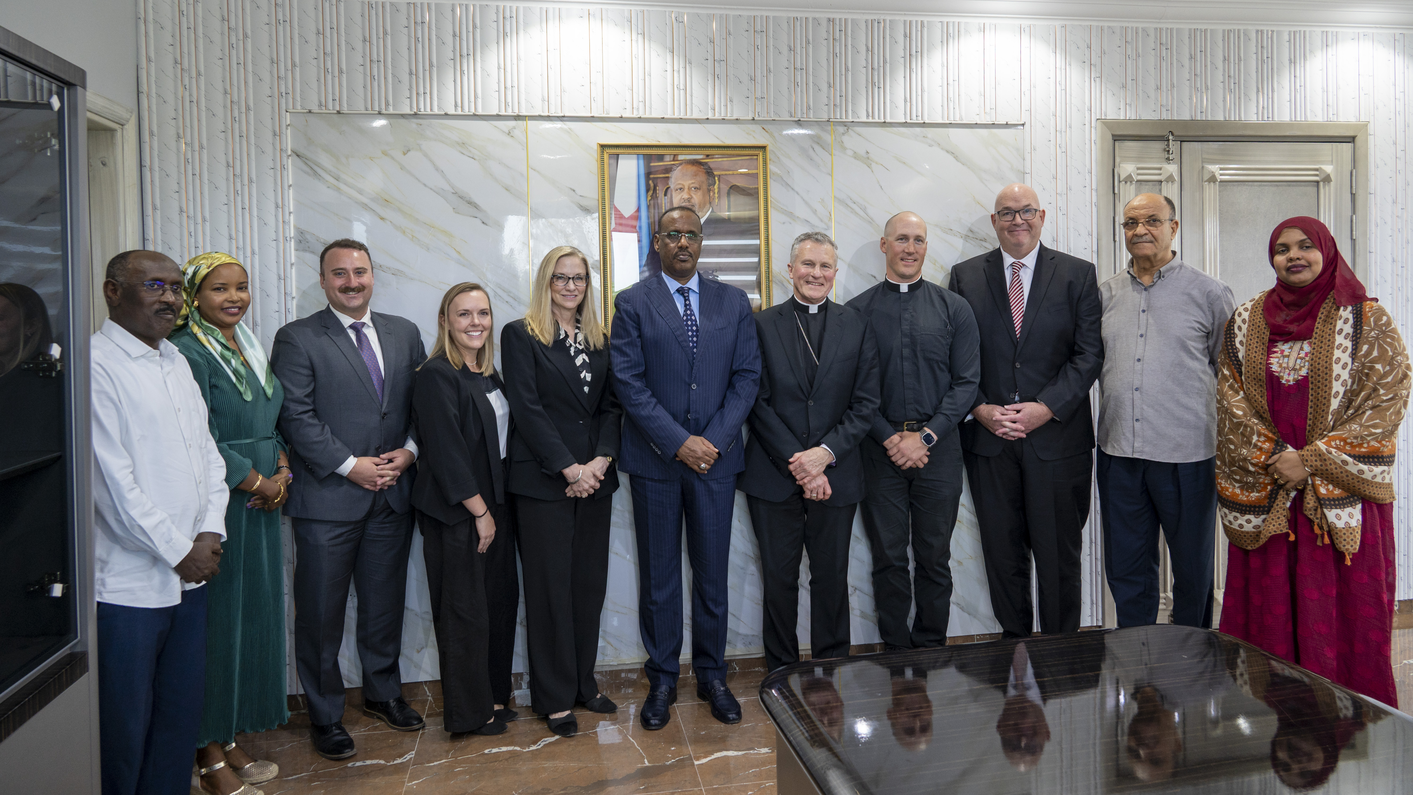 Archbishop Timothy P. Broglio, Archbishop of the Archdiocese for the U.S. Military Services, U.S. Ambassador Cynthia Kierscht, U.S. Ambassador to Djibouti, senior religious Djiboutian leaders and U.S. Embassy and military personnel pose for a photo during the Archbishop’s visit to Djibouti, Dec. 17, 2025. Throughout the week, the Archbishop engaged with U.S. and Djiboutian religious, diplomatic, and military leaders, underscoring religious engagement as a complementary effort to diplomatic and security cooperation. (U.S. Army photo by Sgt. 1st Class Kenneth Tucceri)