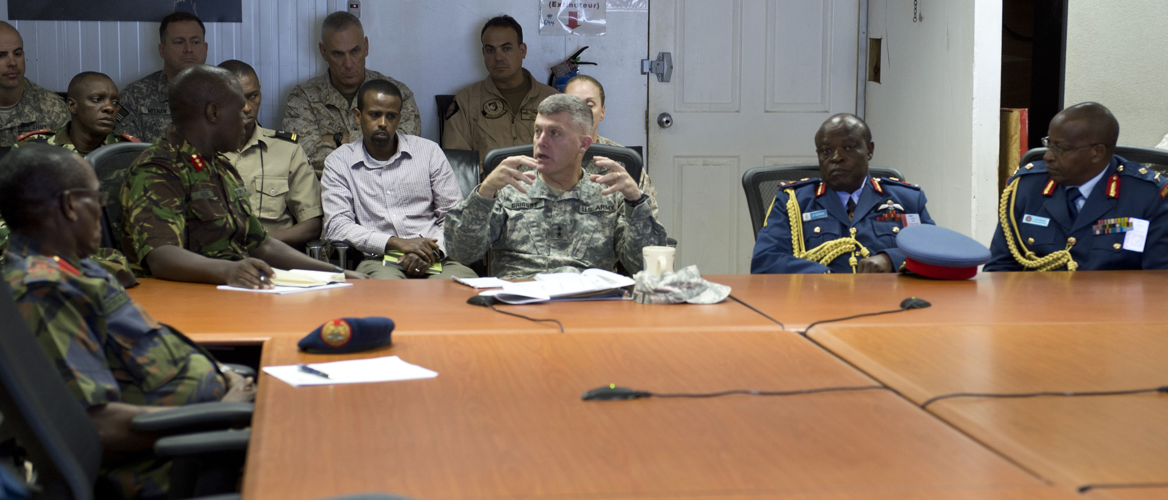 Maj. Gen. Wayne W. Grigsby, Jr., Combined Joint Task Force-Horn of Africa commanding general, meets with East Africa military Leaders at Camp Lemonnier, Djibouti on Feb. 11, 2015. Grigsby directly engaged with the Partner Nations’ military leaders to understand what the Profession of Arms meant to each individual country and encouraged them to instill these principles at all levels of military service. (U.S. Air Force photo by Staff Sgt Kevin Iinuma)