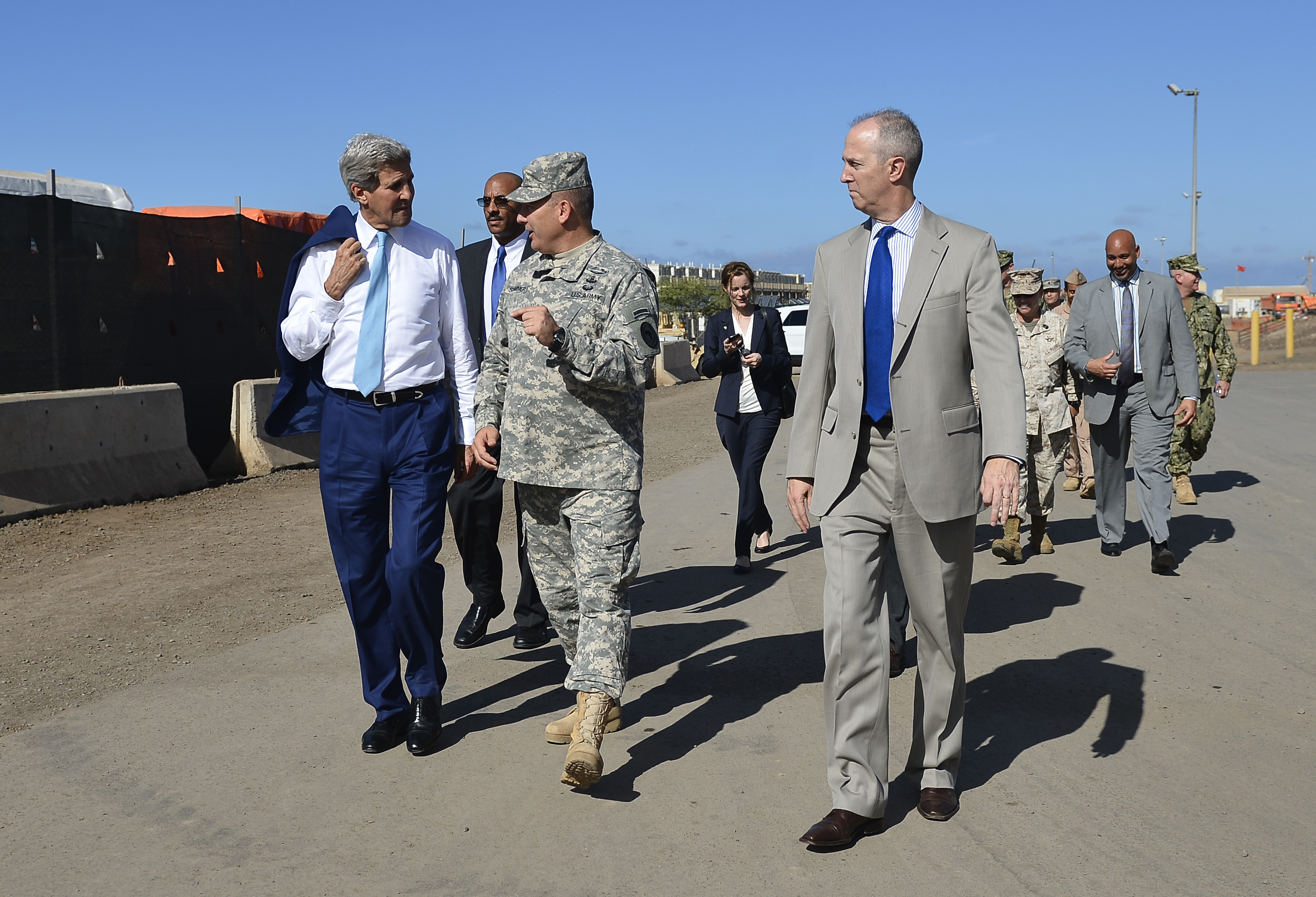 Maj. Gen. Mark R. Stammer, CJTF-HOA Commander, center, and Thomas Kelly, U.S. Ambassador to the Republic of Djibouti, right, give John Kerry, U.S. Secretary of State, Tour at Camp Lemonnier, Djibouti