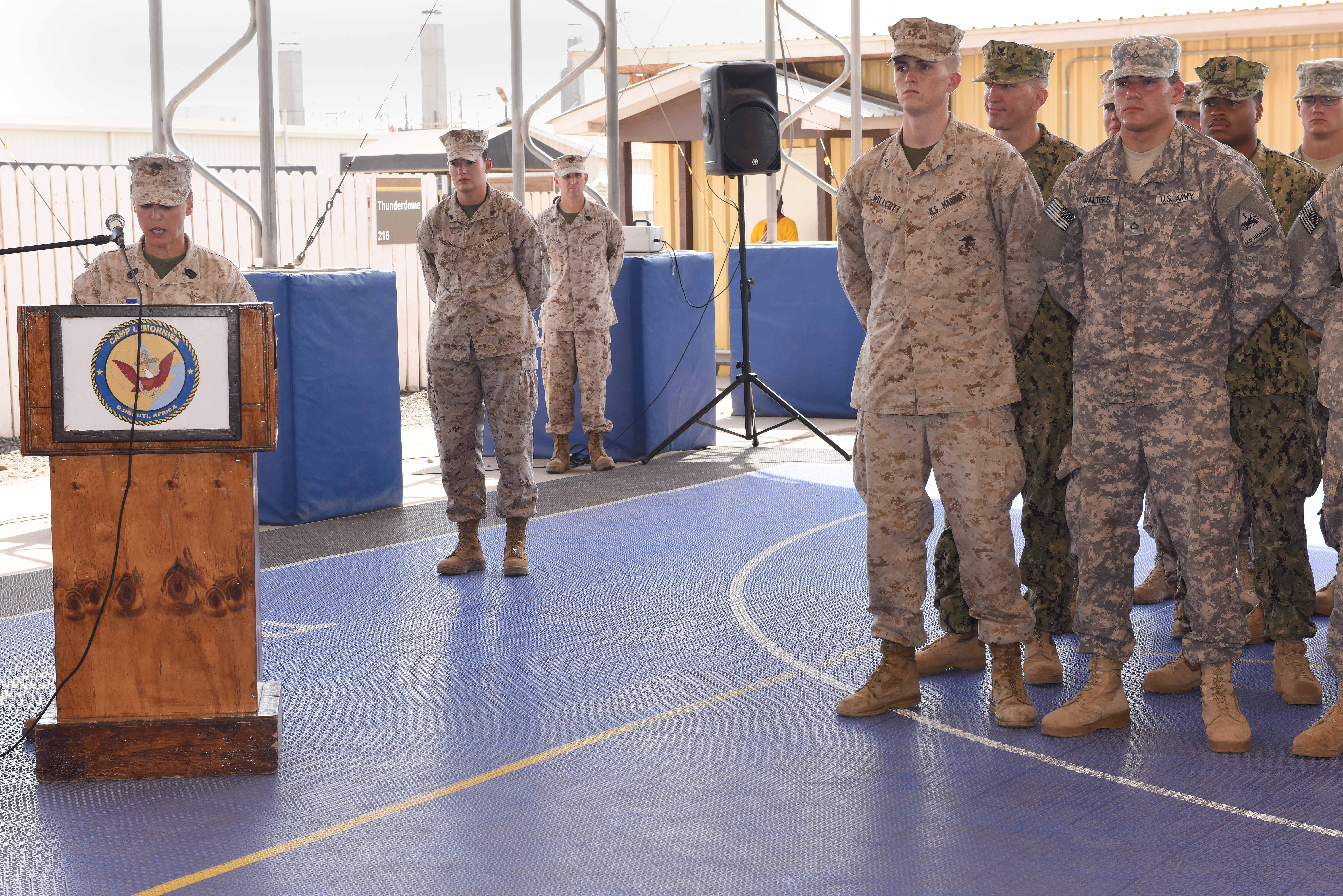U.S. Marine Sgt. Maj. Bonnie Skinner former Combined Joint Task Force-Horn of Africa command senior enlisted leader thanks service members and civilians for their hard work during the relinquishment of authority ceremony May 16, 2015. (U.S. Air Force photo by Staff Sgt. Maria Bowman)