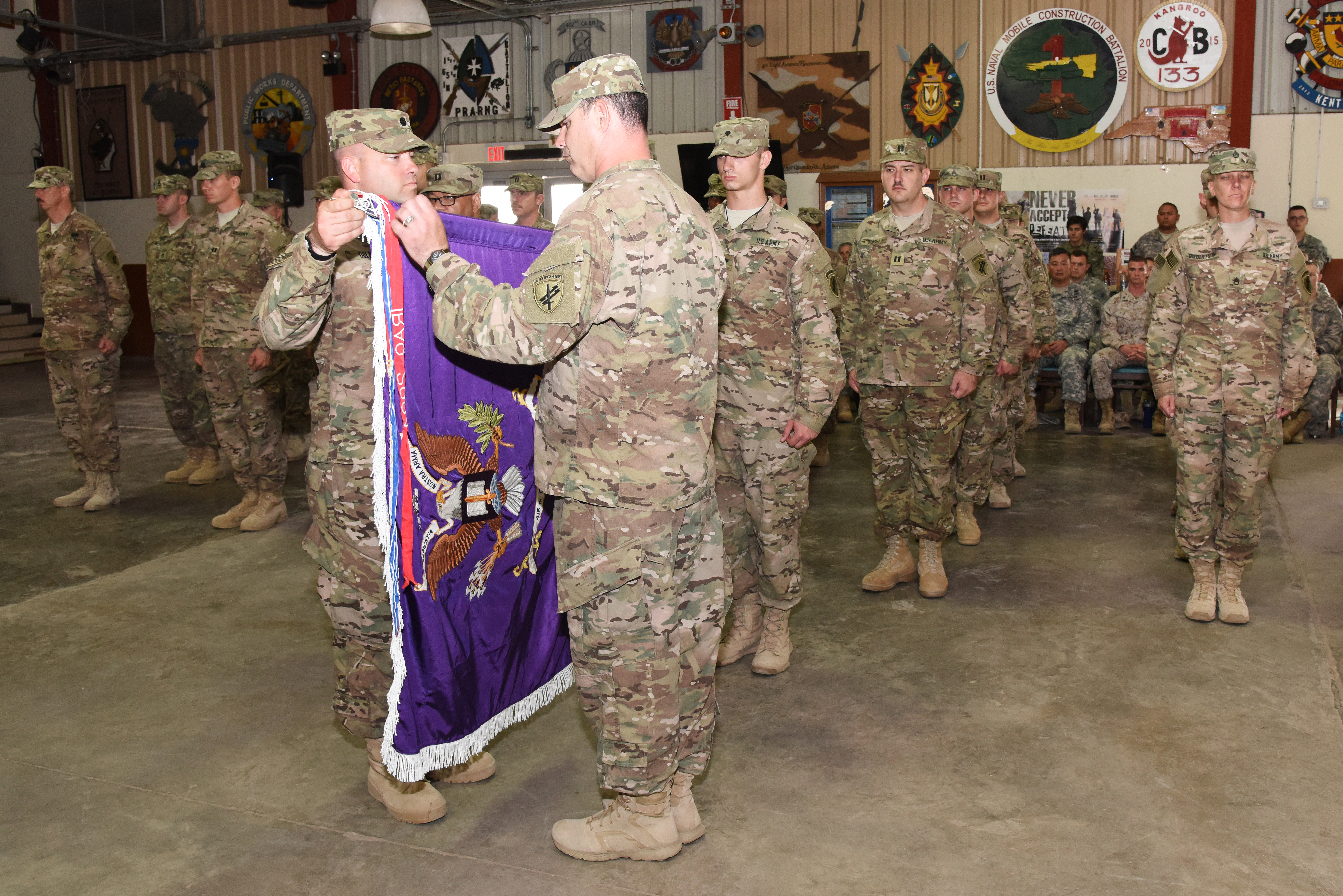 U.S. Army Lt. Col. Gerry Dolan, 415th Civil Affairs Battalion commander, unrolls his unit flag at a transfer of authority ceremony June 22, 2015 at Camp Lemonnier, Djibouti. The uncasing of the battalion colors signifies the company’s arrival from Kalamazoo, Mich., and its preparedness to assume its role within the Combined Joint Task Force-Horn of Africa. (U.S. Air Force photo by Staff Sgt. Maria Bowman)