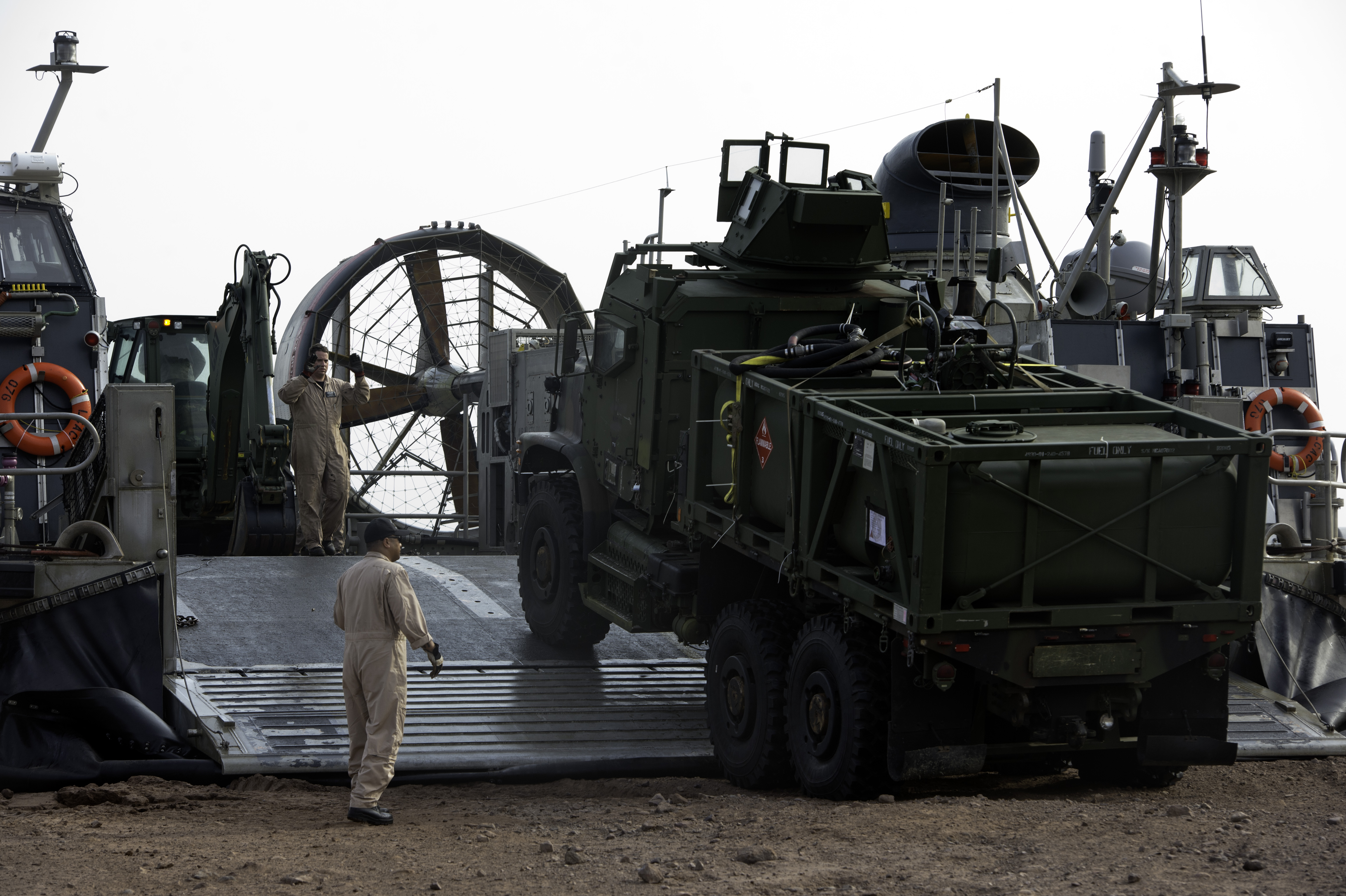 Crewmembers onboard a U.S. Navy Landing Craft Air Cushion (LCAC) help offload a fuel truck at Arta Beach, Djibouti, July 20, 2015. LCACs from the San Antonio-class amphibious transport dock ship USS Anchorage (LPD-23) helped deliver U.S. Marines and equipment from the 15th Marine Expeditionary Unit for sustainment training at the Djiboutian Armed Forces training range. (U.S. Air Force photo by Staff Sgt. Nathan Maysonet)