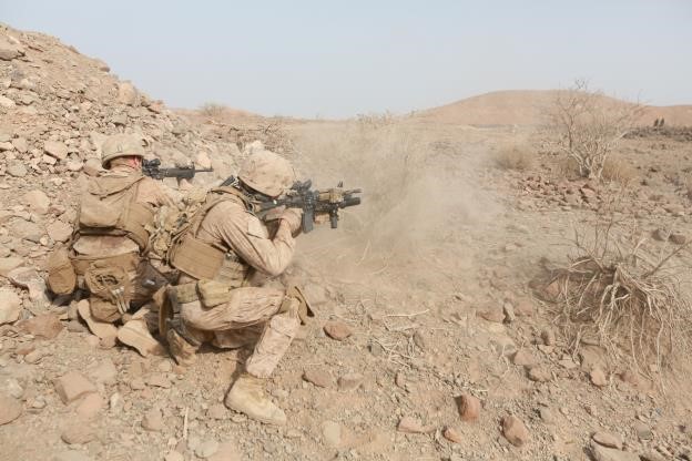 150729-M-TJ275-391 ARTA BEACH, Djibouti (July 29, 2015) U.S. Marines with Light Armored Reconnaissance Detachment, Battalion Landing Team 3rd Battalion, 1st Marine Regiment, 15th Marine Expeditionary Unit, engage targets in a fire-and-maneuver exercise during sustainment training. Elements of the 15th MEU are ashore in Djibouti for sustainment training to maintain and enhance the skills they developed during their pre-deployment training period. The 15th MEU is currently deployed in support of maritime security operations and theater security cooperation efforts in the U.S. 5th and 6th Fleet areas of operation. (U.S. Marine Corps photo by Sgt. Steve H. Lopez/Released)