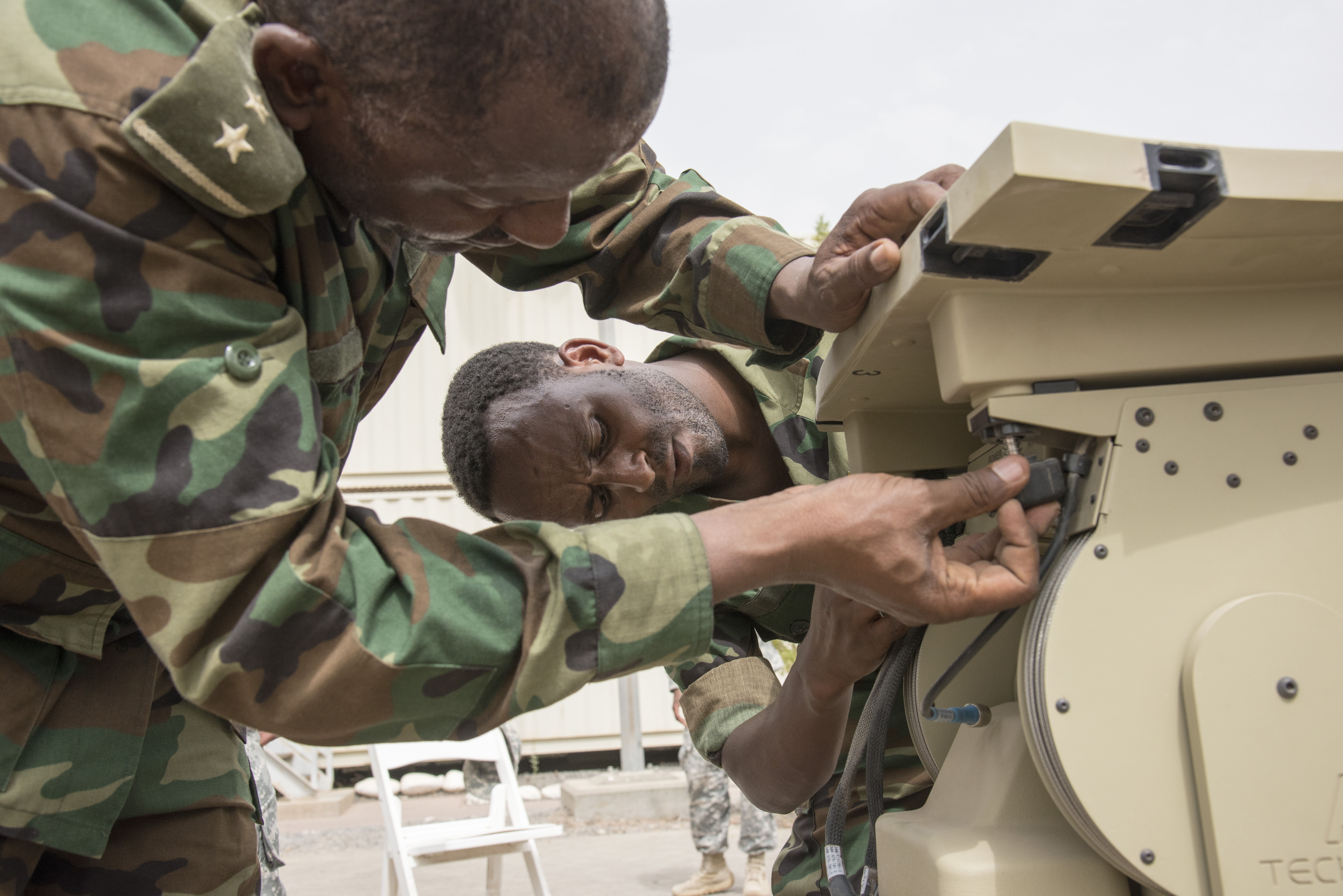 Members of the Ethiopian National Defense Force (ENDF) assemble the dish of a U.S. Africa Command Data Sharing Network (ADSN) terminal at Camp Lemonnier, Djibouti, Aug 18, 2015. The ADSN terminal is an enclosed network, meaning it never connects to the internet, and is used by African Mission in Somali forces for field communications. Its setup and use was part of a multi-week ADSN course designed to broaden communication interoperability between host nation security forces, and was hosted by communications and intelligence personnel assigned to Combined Joint Task Force-Horn of Africa. (U.S. Air Force photo by Staff Sgt. Nathan Maysonet/released)