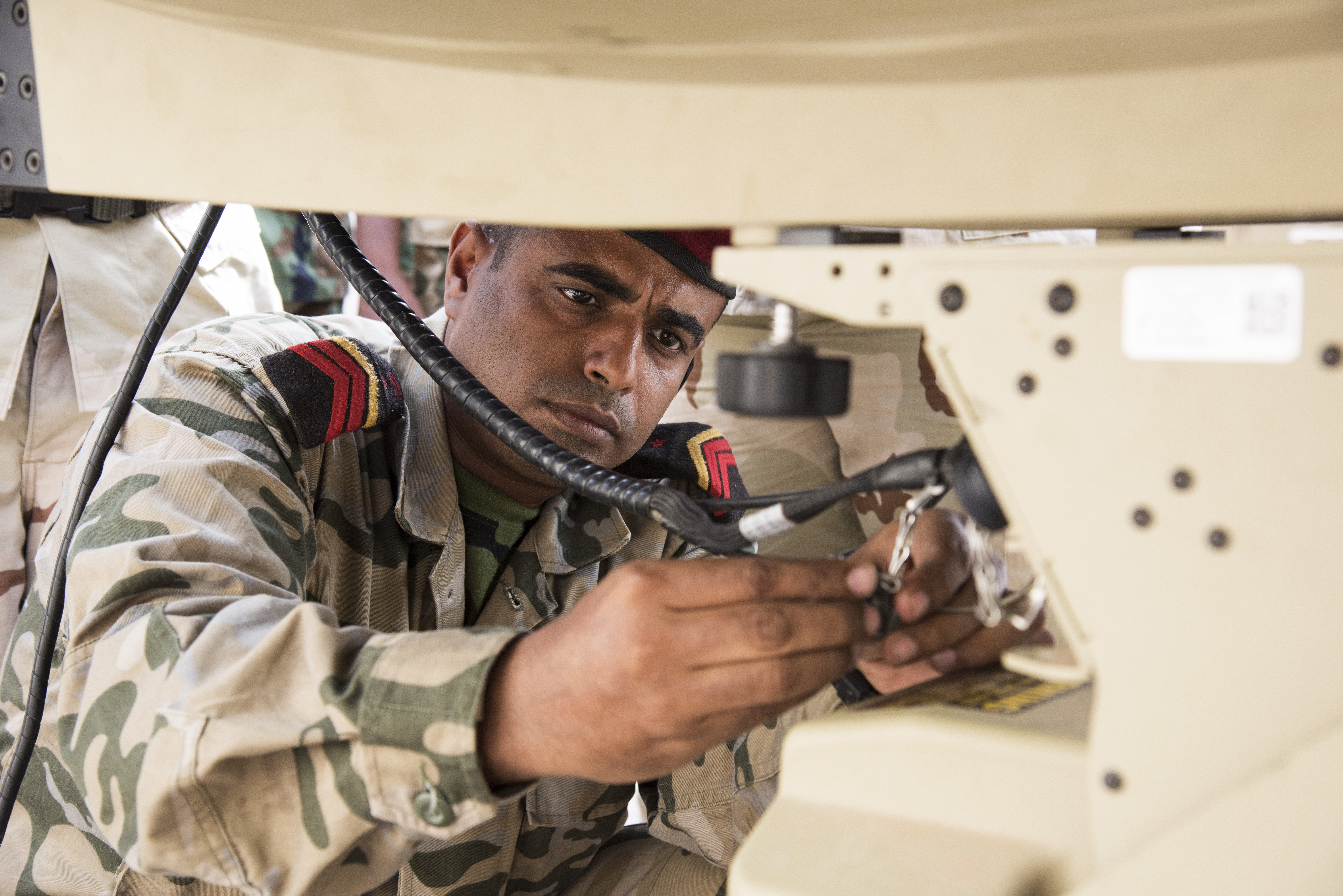 A member of the Djibouti Armed Forces (FAD) connects a cable connector during the setup of a U.S. Africa Command Data Sharing Network (ADSN) terminal at Camp Lemonnier, Djibouti, Aug. 31, 2015. FAD personnel were tested on how quickly they could setup and tear down the field communication system as part of a multi-week ADSN course, which was hosted by Combined Joint Task Force-Horn of Africa communications and intelligence personnel, and was designed to broaden communication interoperability between host nation security forces. (U.S. Air Force photo by Staff Sgt. Nathan Maysonet/released)