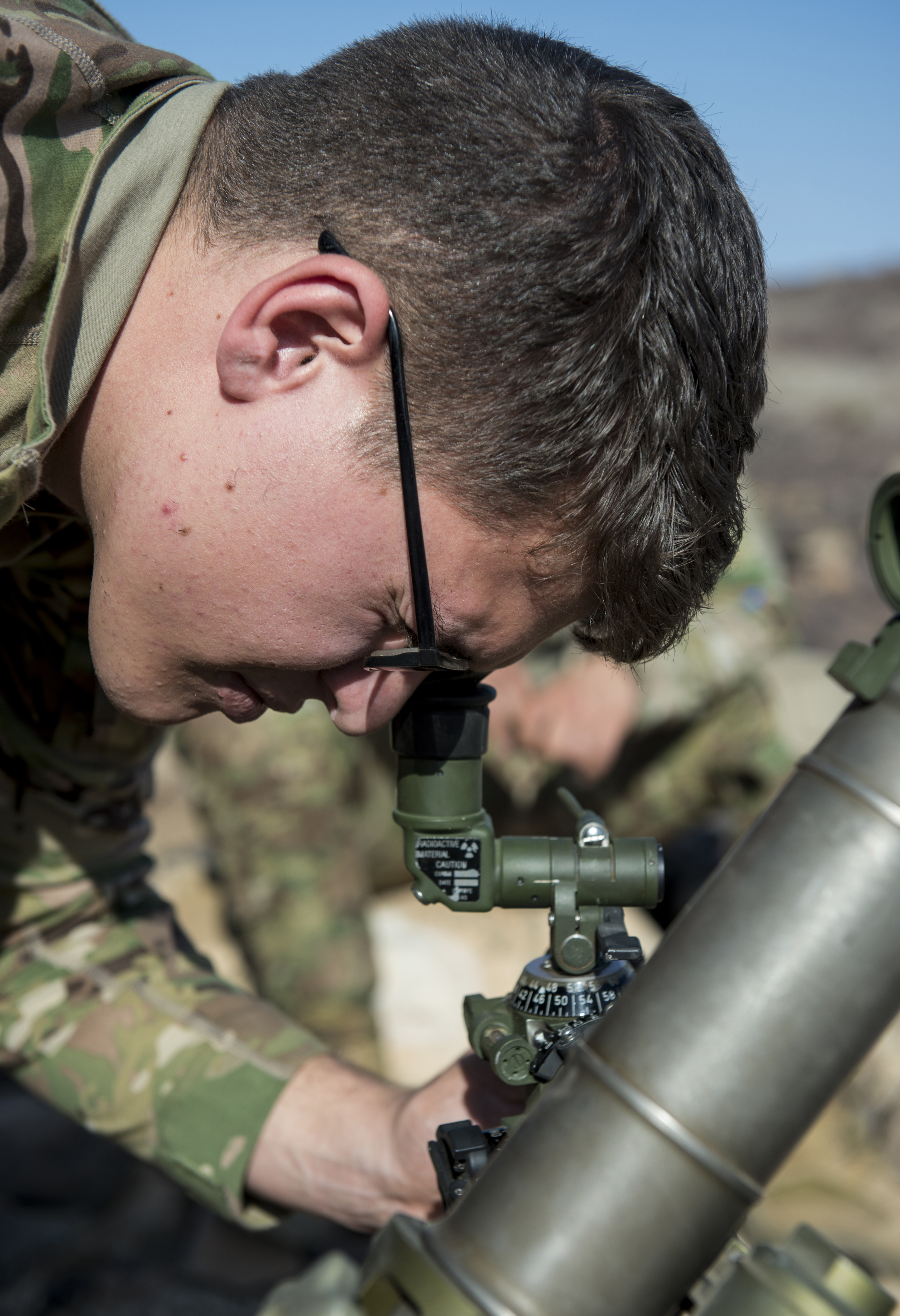 U.S. Army Spc. Tyler Rodriguez, Alpha Company, 3rd Battalion, 15th Infantry Regiment mortar gunner, aligns sights on a M224 60mm mortar launcher October 12, 2015, in Arta, Djibouti. Alpha Company operates using light infantry and various other force enablers, which operate together cohesively to accomplish their mission. (U.S. Air Force photo by Senior Airman Peter Thompson/Released)