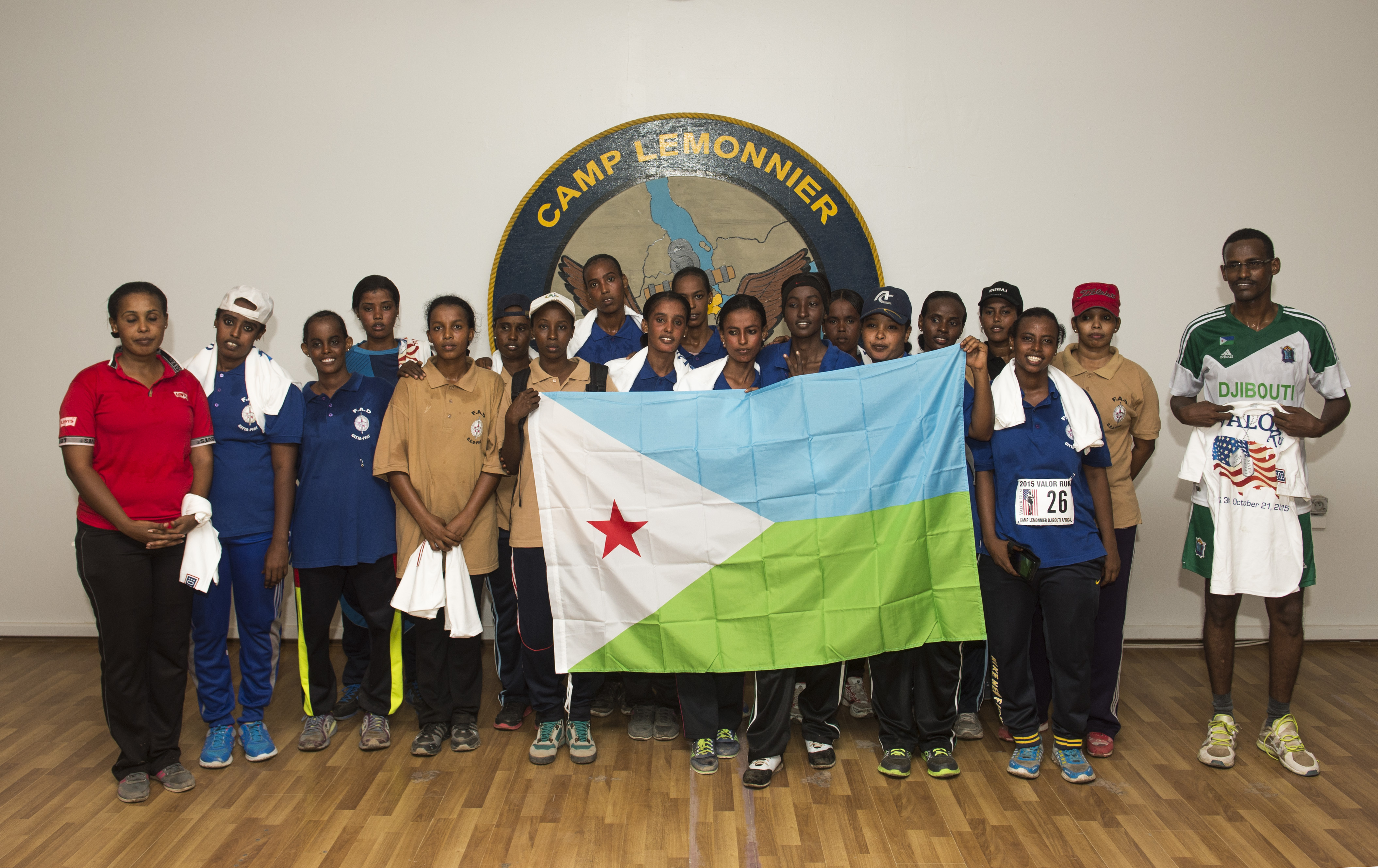 Members of the Djibouti Armed Forces (FAD) stand together after a Valor Run Oct. 21, 2015, at Camp Lemonnier, Djibouti. Twenty-one FAD personnel showed their support to the United States and its fallen female veterans. (U.S. Air Force photo by Senior Airman Peter Thompson/Released)