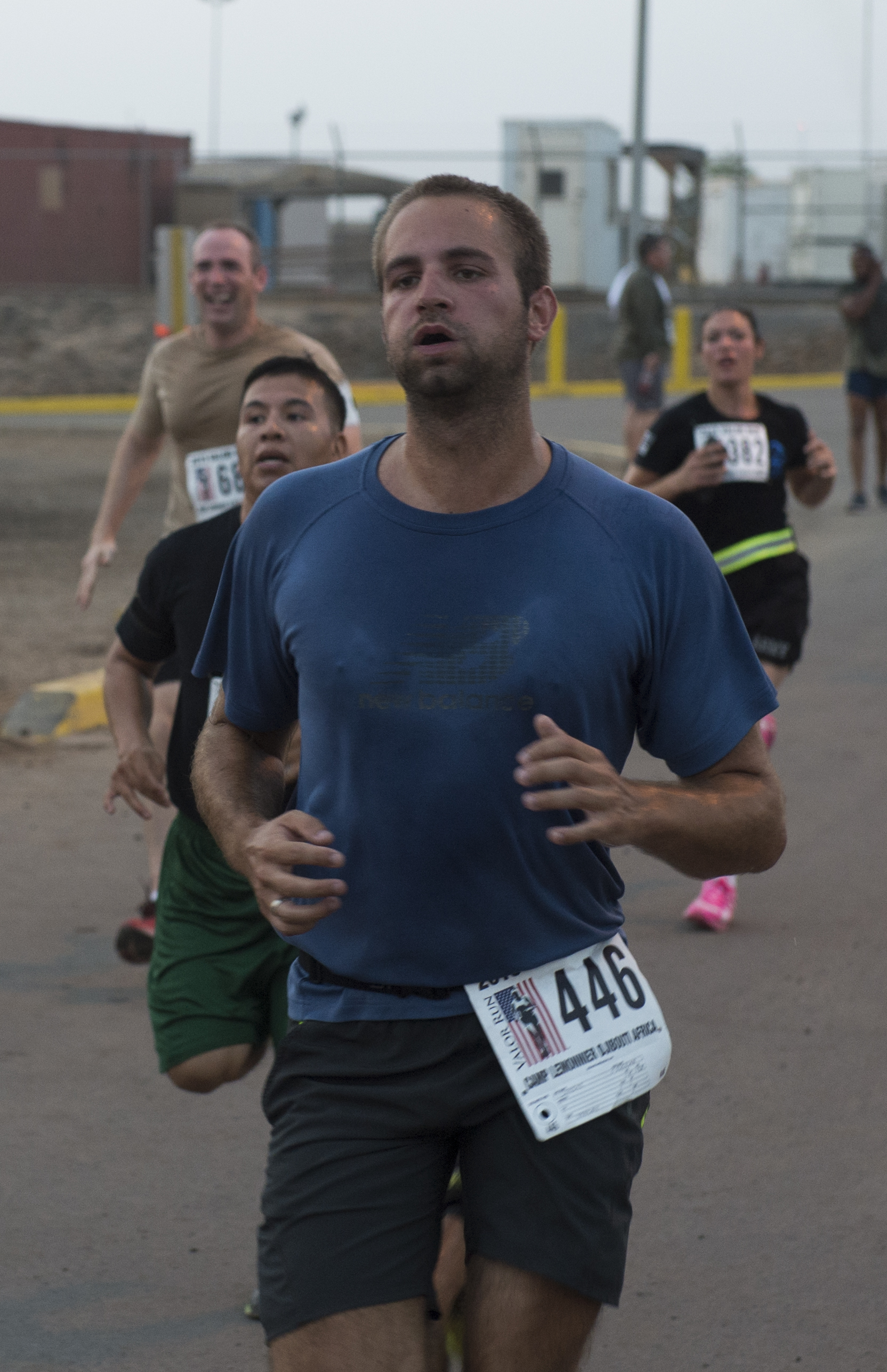 Participants of a Valor Run approach the finish line Oct. 21, 2015, at Camp Lemonnier, Djibouti. More than 800 members of Combined Joint Task Force-Horn of Africa and Camp Lemonnier ran a 5K or walked a 3K course in remembrance of fallen female service members. (U.S. Air Force photo by Senior Airman Peter Thompson/Released)