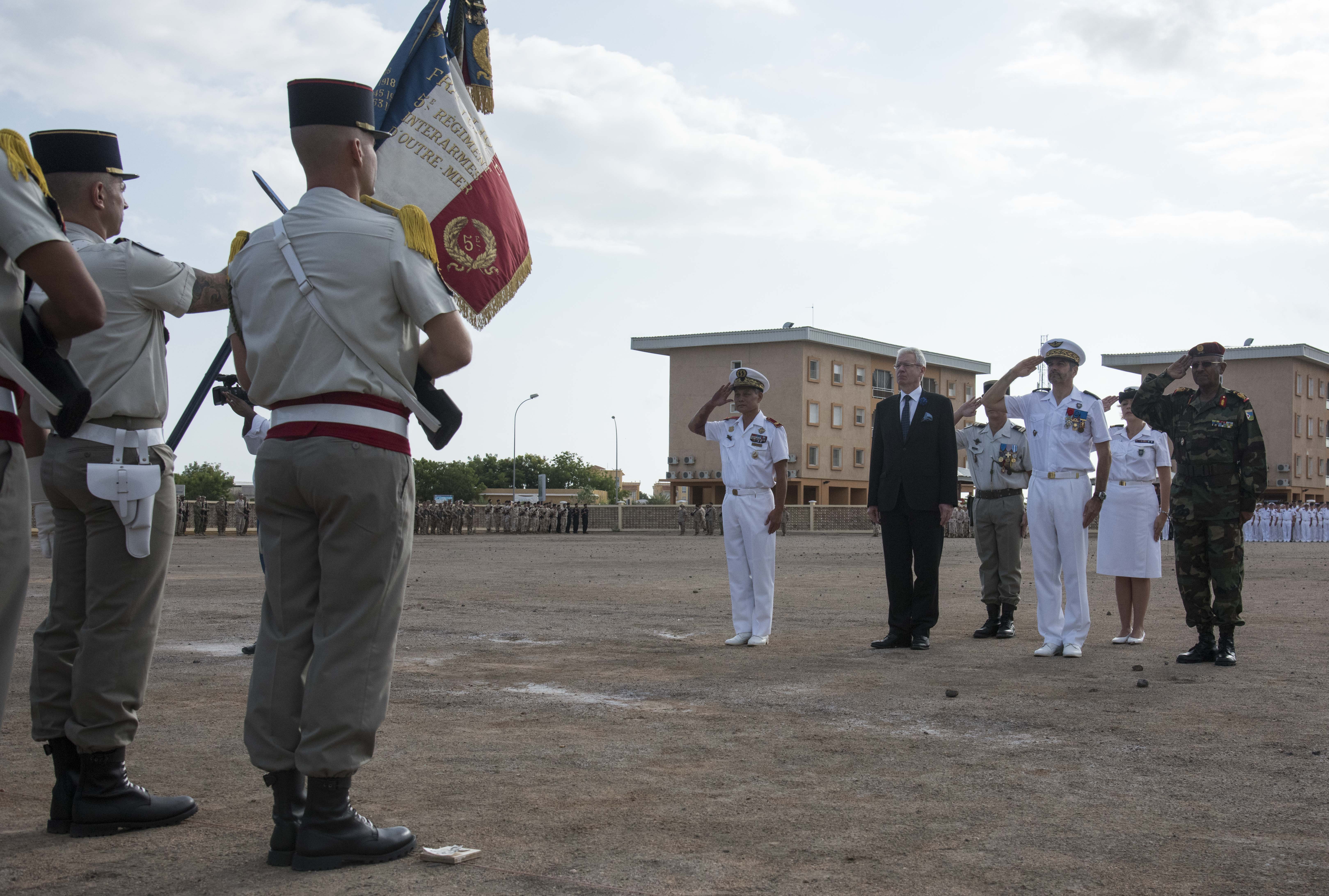 The officiating party salutes the colors of the 5th Foreign Infantry Regiment during the Armistice Day ceremony at the French Marine Base, Nov. 11, 2015. The ceremony commemorated the end of hostilities in World War I.