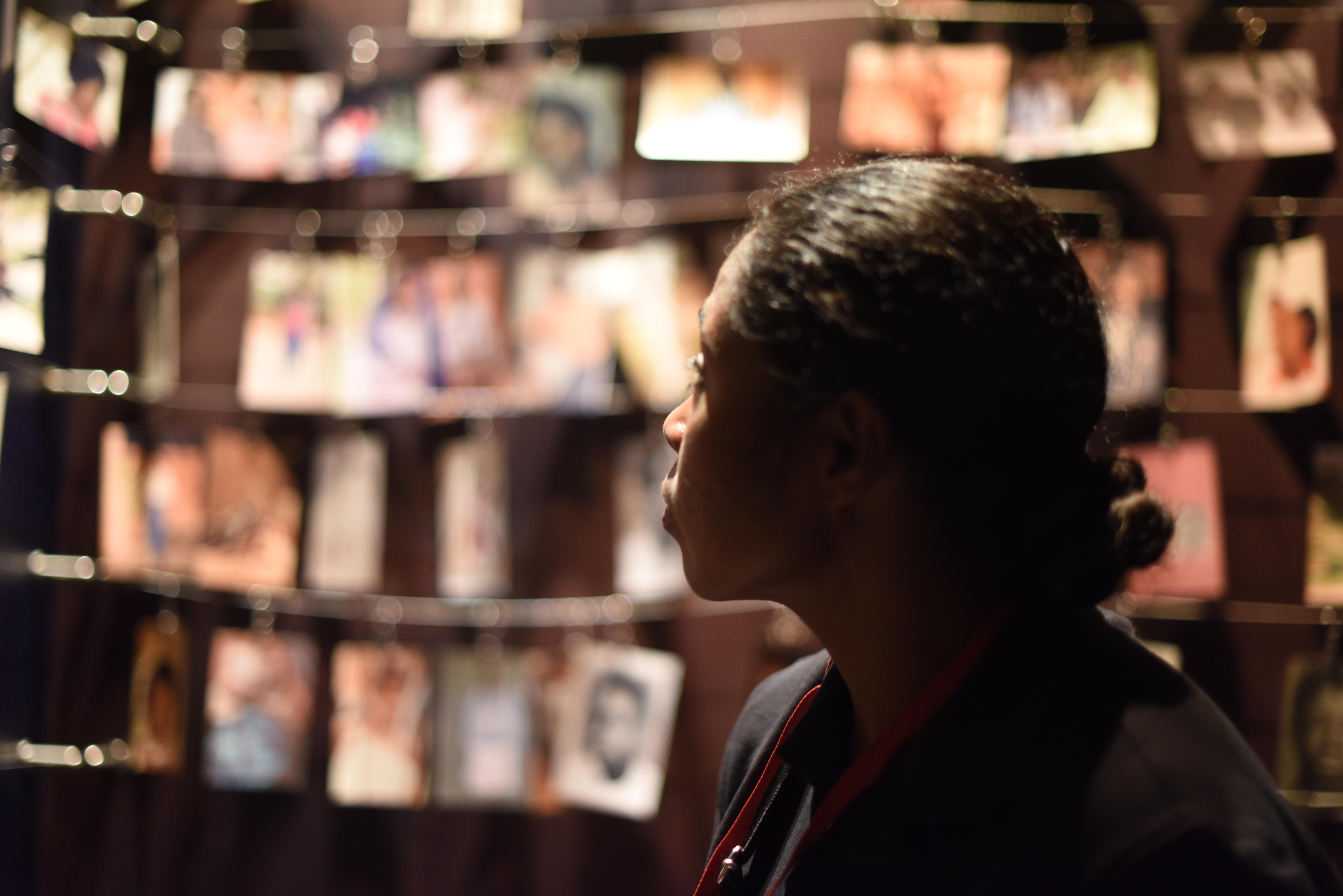 U.S. Navy Senior Chief Cheryl Norris from Combined Joint Task Force-Horn of Africa looks at photos of victims at the Genocide Memorial Museum in Kigali, Rwanda, Dec. 16, 2015. Family members of those lost in the genocide contributed photos to the museum in their memory. The photo room contains thousands of personal photos. (U.S. Air Force photo by Staff Sgt. Victoria Sneed)