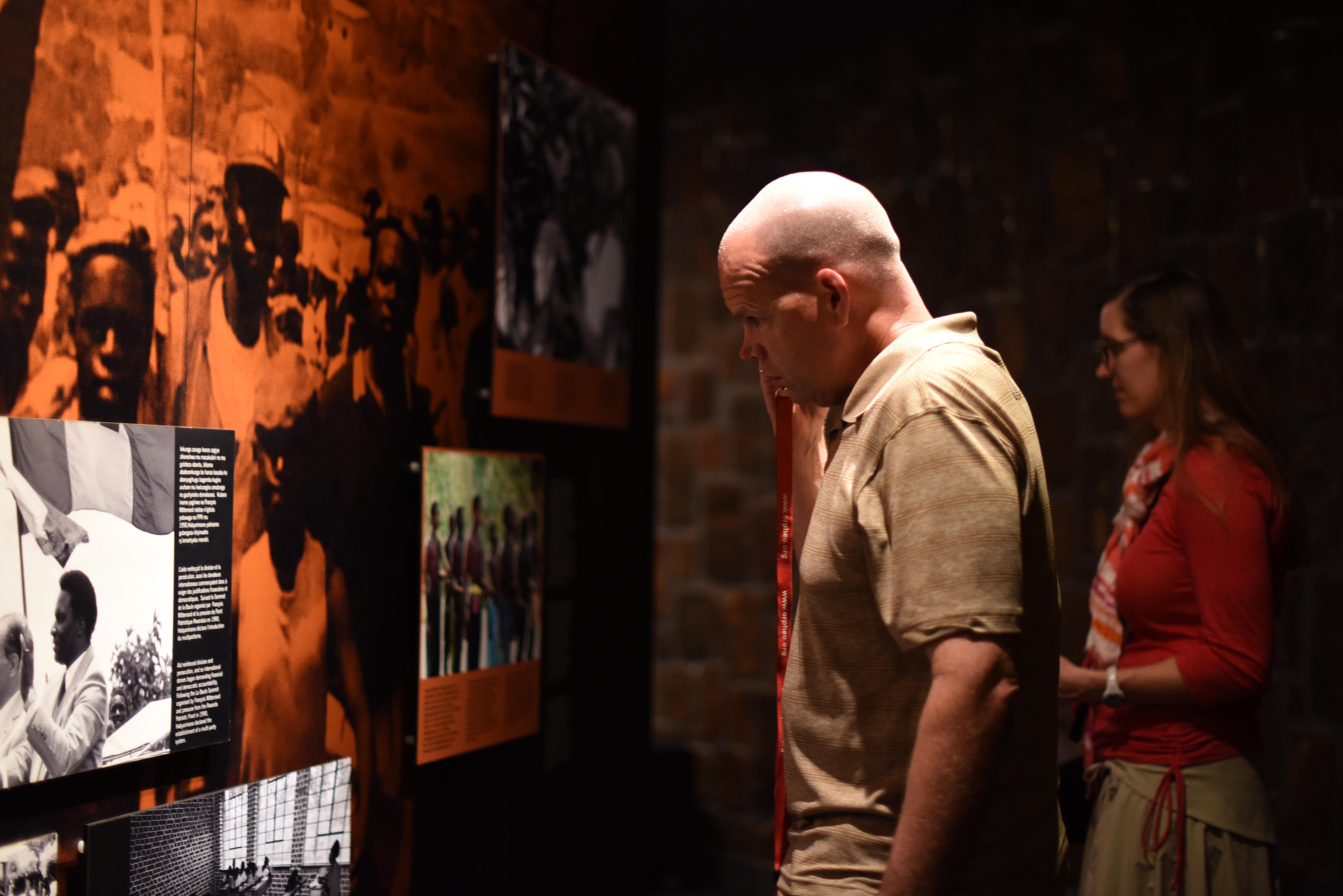 U.S. Navy Lt. Steven Hunt and U.S. Marine Corps Maj. Bevin Keen from Combined Joint Task Force-Horn of Africa listen to introductions at the Genocide Memorial Museum in Kigali, Rwanda, Dec. 16, 2015. The museum exhibits photos, media and artwork related to the 1994 genocide against the Tutsi in Rwanda. Survivors provided testimony to help tell the story for future generations. (U.S. Air Force photo by Staff Sgt. Victoria Sneed)