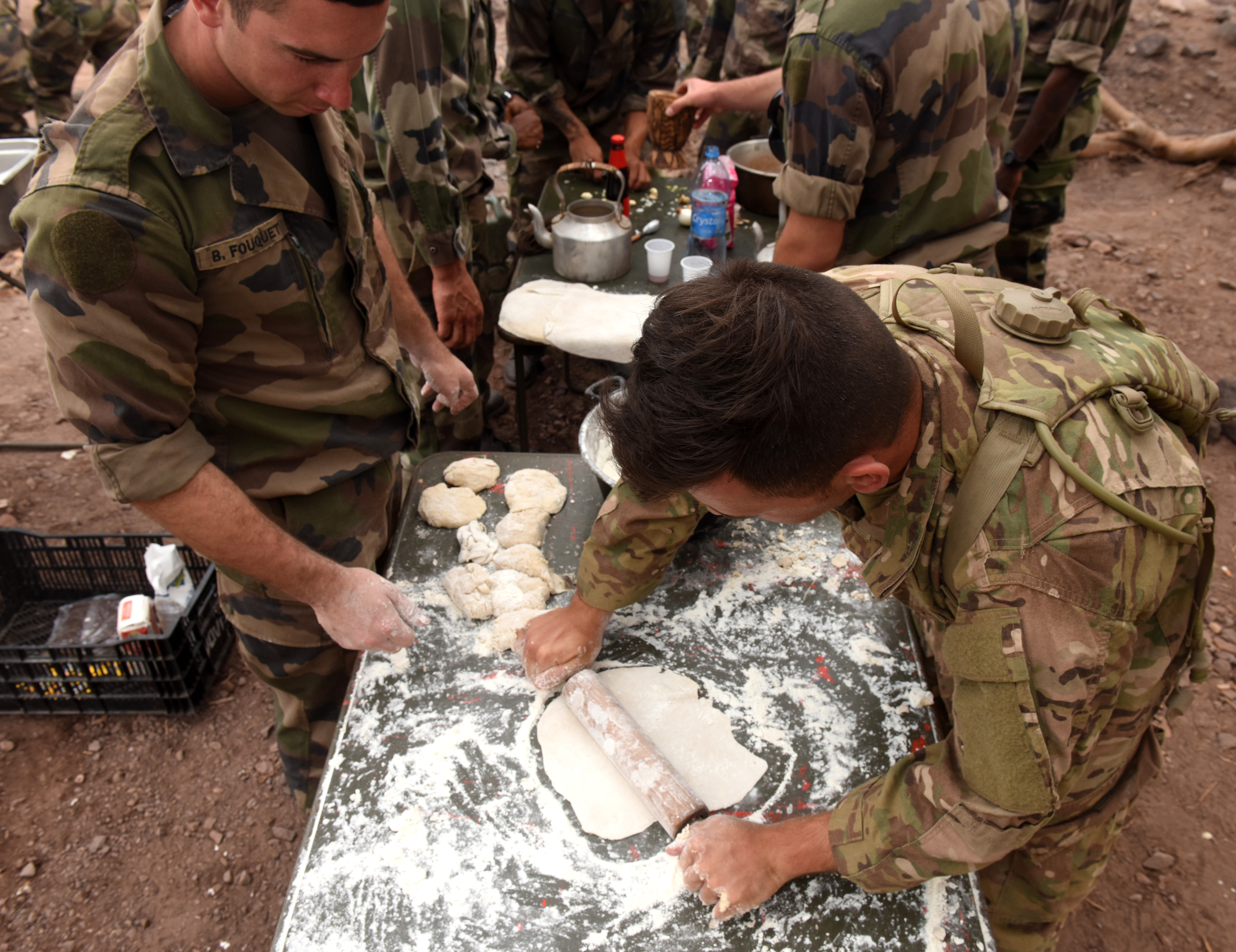 U.S. and French soldiers make flatbread during a French Desert Survival Course near Arta Beach, Djibouti, Jan. 13, 2016. Using techniques that can be used in survival situations, students worked together to make a meal for the whole group. (U.S. Air Force photo by Staff Sgt. Kate Thornton)