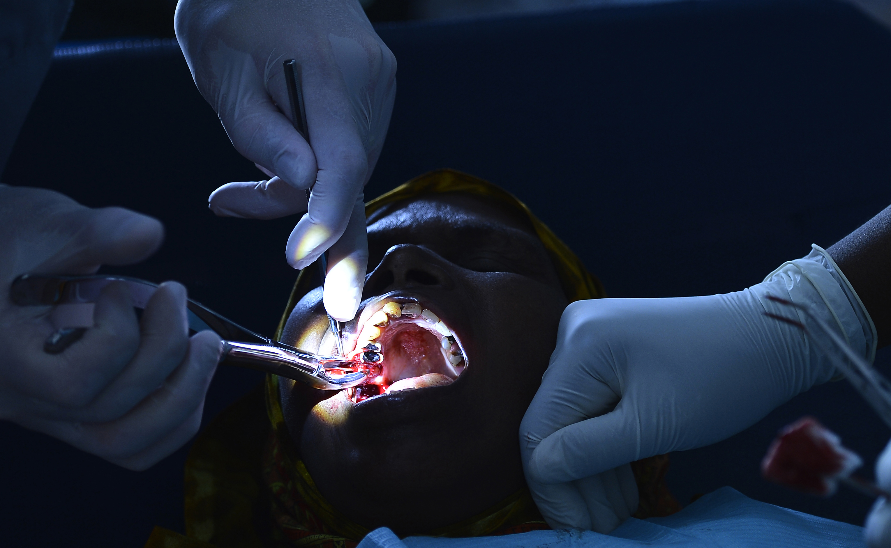 Capt. Bryan Hays, 403rd Civil Affair Battalion Dental Cell Officer in Charge, and Staff Sgt. Nakisha Susberry, 403rd CA BN Dental Cell NCO in charge, work on extracting a tooth during a dental civic action program mission in Ali Sabieh, Djibouti, Feb. 10, 2016. Members of the Djibouti Ministry of Health and the 403 CA BN removed more than 50 infected teeth during two days of dental assistance to the local villagers. (U.S. Air Force photo by Tech. Sgt. Dan DeCook)