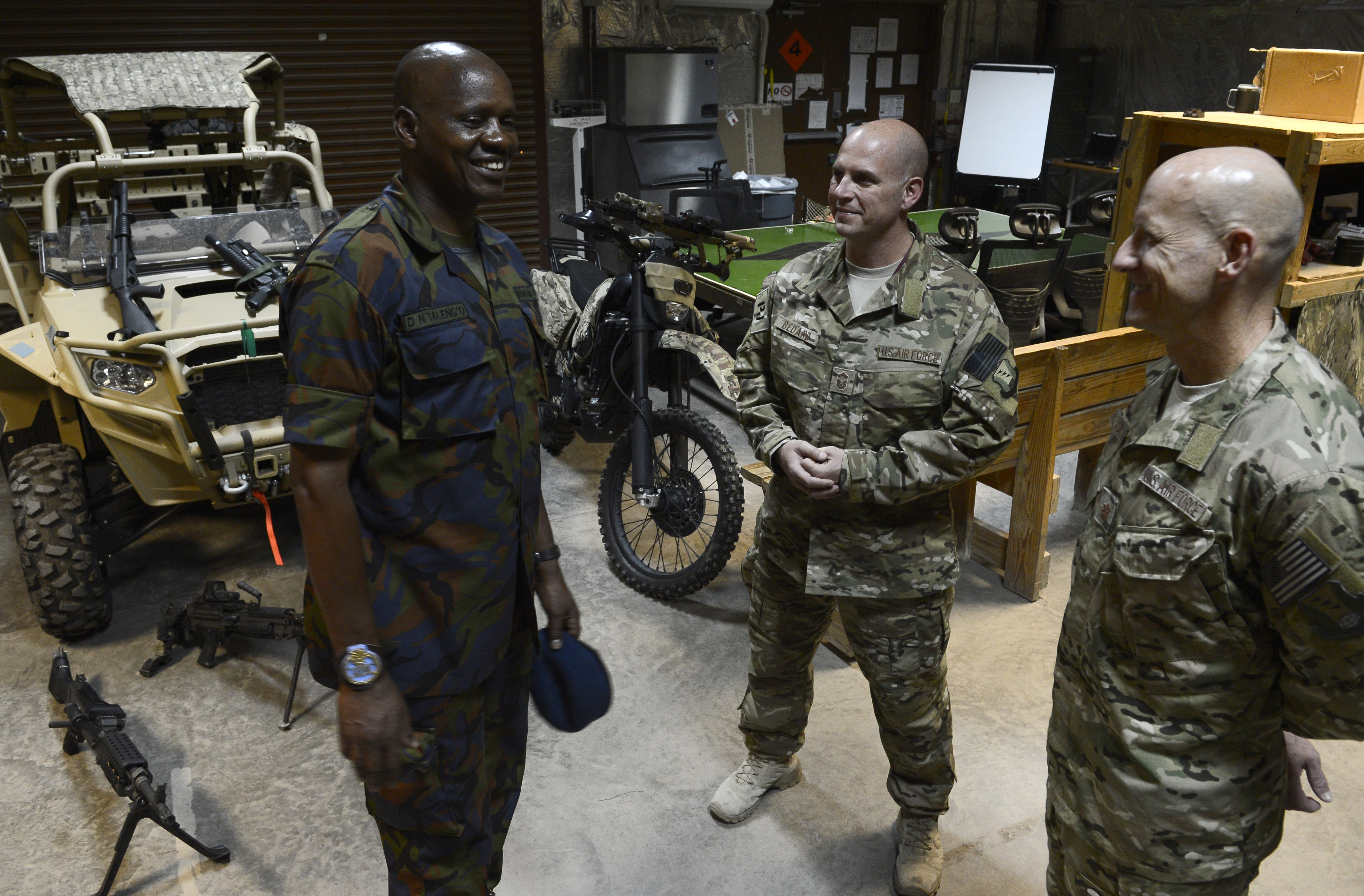 Kenya Air Force Warrant Officer Dennis Talengo, Kenya Air Force sergeant major, speaks with Maj. Anthony Alexander, 82nd Expeditionary Rescue Squadron commander, and Senior Master Sgt. Maurice Bedard, 82nd ERQS superintendent, Feb. 10, 2016, at Camp Lemonnier, Djibouti. The partnerships built and strengthened between the leaders is vital for ensuring mission success – for AMISOM, the current situation in Somalia, neutralizing Al-Shabaab, and stabilizing the region. (U.S. Air Force photo by Senior Airman Peter Thompson)