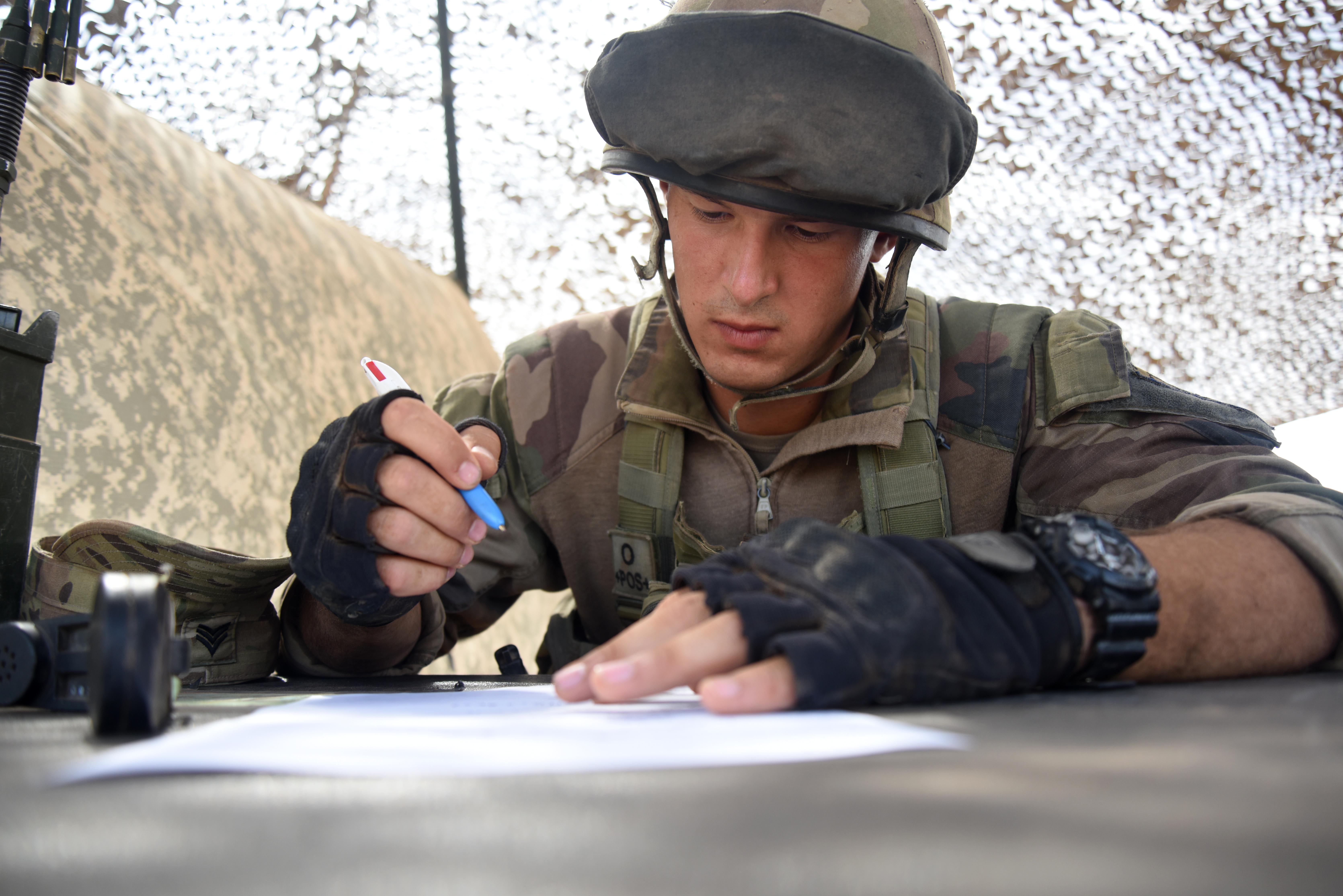 A French Army Soldier completes an activity report March 31, 2016, during the patrolling portion of the EIB course at Camp Lemonnier, Djibouti. Candidates had to create a report based on simulated suspicious activity and call it in to the evaluator. (U.S. Air Force photo by Staff Sgt. Kate Thornton)