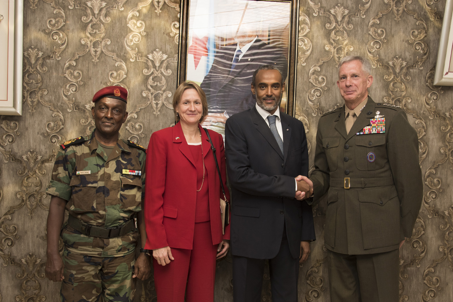 DJIBOUTI- (From left) Djiboutian Gen. Taher Ali Mohamed, Djiboutian Armed Forces; Christina Higgins, U.S. Embassy in Djibouti deputy chief of mission; Ali Hassan Bahdon, Djibouti minister of defense; and Commander, U.S. Africa Command U.S. Marine Corps Gen. Thomas Waldhauser, pose for a group photo, Aug. 18, 2016, after a meeting at the Djiboutian Armed Forces headquarters, Djibouti. This is Waldhauser’s first official visit to Djibouti since assuming command of AFRICOM in July 2016. (U.S. Air Force photo by Staff Sgt. Tiffany DeNault)