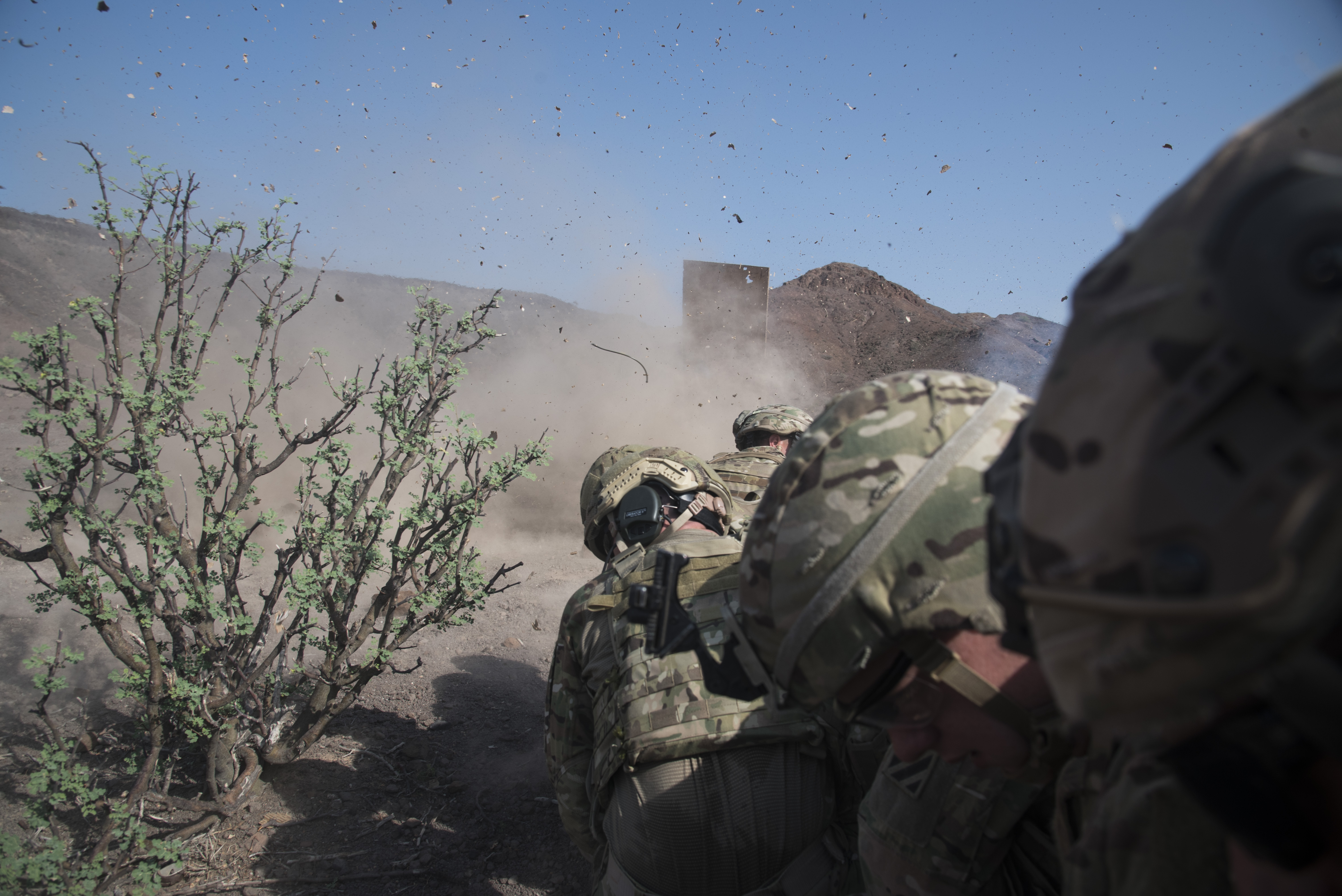 U.S. Army Soldiers from the Bravo Company, 3rd Battalion, 15th Infantry Regiment, detonate explosives secured to a wood board during demolition training to learn how to breach through buildings, Aug. 30, 2016, in Arta, Djibouti. Bravo Co. 3/15 Inf. Rgt., from Fort Stewart, Ga., serves as the East Africa Response Force assigned to Combined Joint Task Force-Horn of Africa to provide rapid response and security to protect embassies and foreign assets in the area of responsibility of CJTF-HOA. (U.S. Air Force photo by Staff Sgt. Tiffany DeNault)