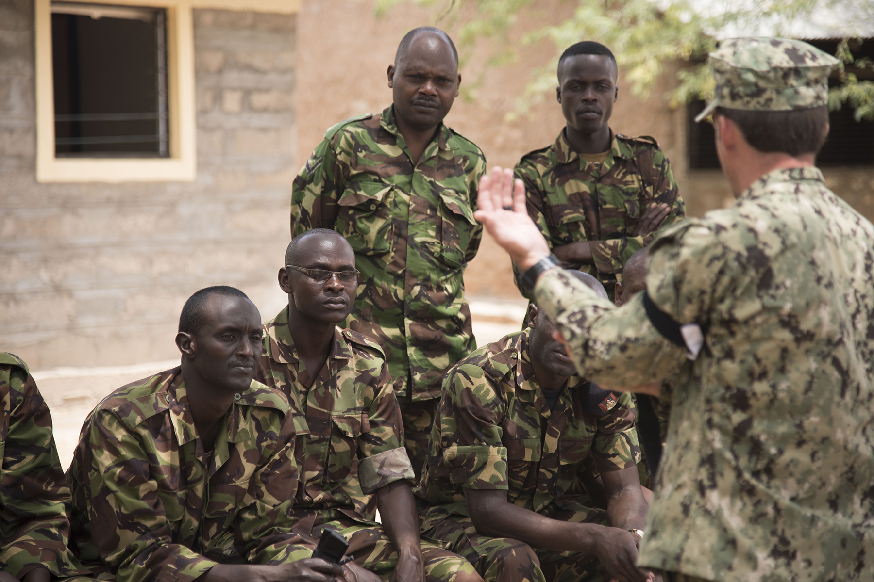 KENYA- U.S. Navy Chief Petty Officer Ryan Waller, Task Force Sparta explosive ordnance disposal technician and Deliberate Kindle instructor, shows Kenyan Defense Force soldiers and officers how to properly use a tourniquet during tactical combat medical training, Sept. 14, 2016, at a Kenyan training center. Deliberate Kindle is a four-week Humanitarian Mine Action course designed to provide training in countering improvised explosive devices and unexploded ordnance, train-the-trainer, and medical training to approximately 53 KDF soldiers in preparation for future deployments with the African Union Mission in Somalia. (U.S. Air Force photo by Staff Sgt. Tiffany DeNault)
