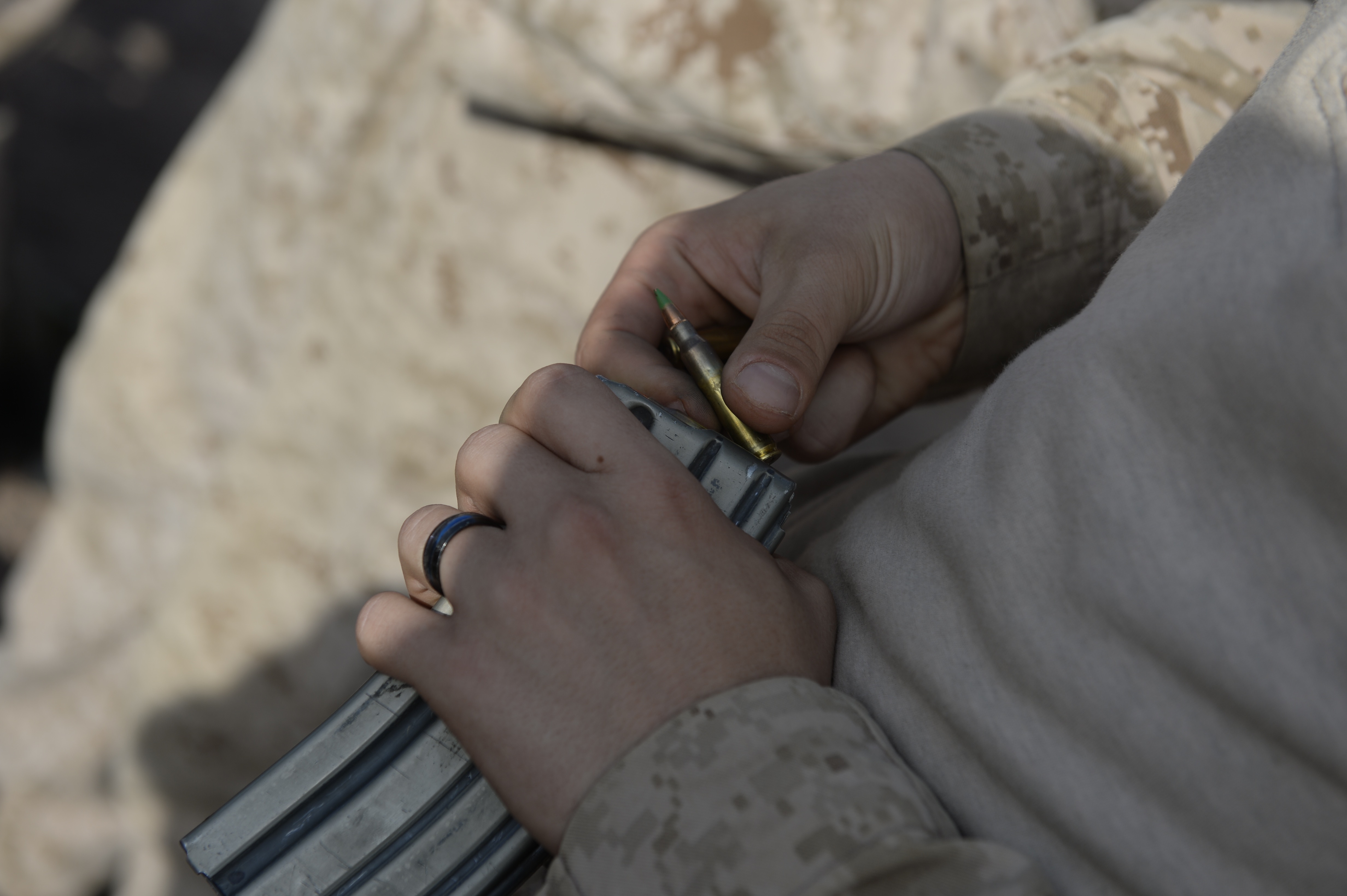 ARTA, Djibouti – A U.S. Marine assigned to Special-Purpose Marine Air-Ground Task Force Crisis Response-Africa (SPMAGTF-CR-AF) loads a magazine during live fire small arms fire team training, Oct. 5, 2016, at Arta, Djibouti. Assigned to Combined Joint Task Force-Horn of Africa, SPMAGTF-CR-AF completed team level range drills to continue sustainment of core skills and build from individual skill levels. The next level of training will consist of squad training. (U.S. Air Force photo by Staff Sgt. Rion Ehrman)