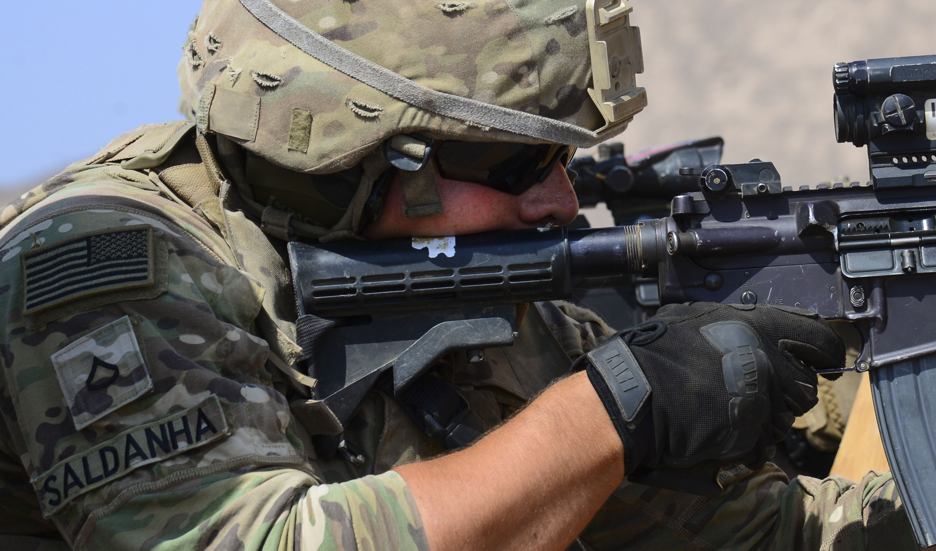 Pfc. Fabio Saldanha, Delta Company, 1st Battalion, 124th Infantry Regiment gunner, engages a simulated target during a fire team exercise in Arta, Djibouti, Oct. 20, 2016. During the exercise, one team would provide cover fire while the other team advanced on a simulated target. The intent of the exercise was to teach soldiers how to move from inside a vehicle when in contact with the enemy, exit the vehicle, and then return fire effectively using live ammunition on simulated targets. (U.S. Air Force photo by Staff Sgt. Benjamin Raughton)