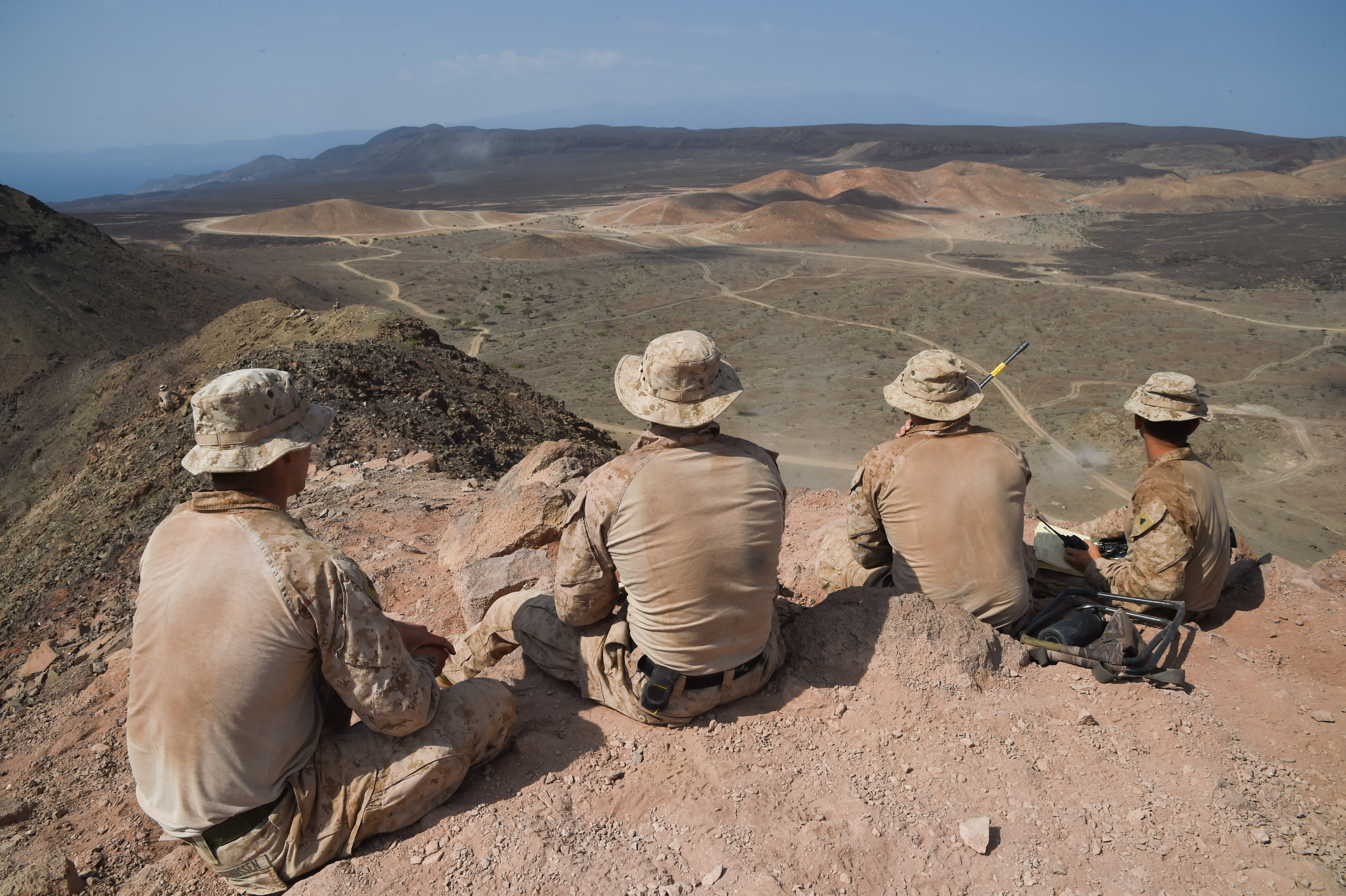 U.S. Marine Corps members with 1st Air Naval Gunfire Liaison Company (ANGLICO), 11th Marine Expeditionary Unit (MEU), communicate with players on the range during Exercise Alligator Dagger, Dec. 18, 2016, at Arta Plage, Djibouti. On the ground, ANGLICO is tasked to communicate and coordinate with air or naval gunfire assets, as well as provide situational updates of target sites during their bombardment. (U.S. Air National Guard photo by Staff Sgt. Penny Snoozy)