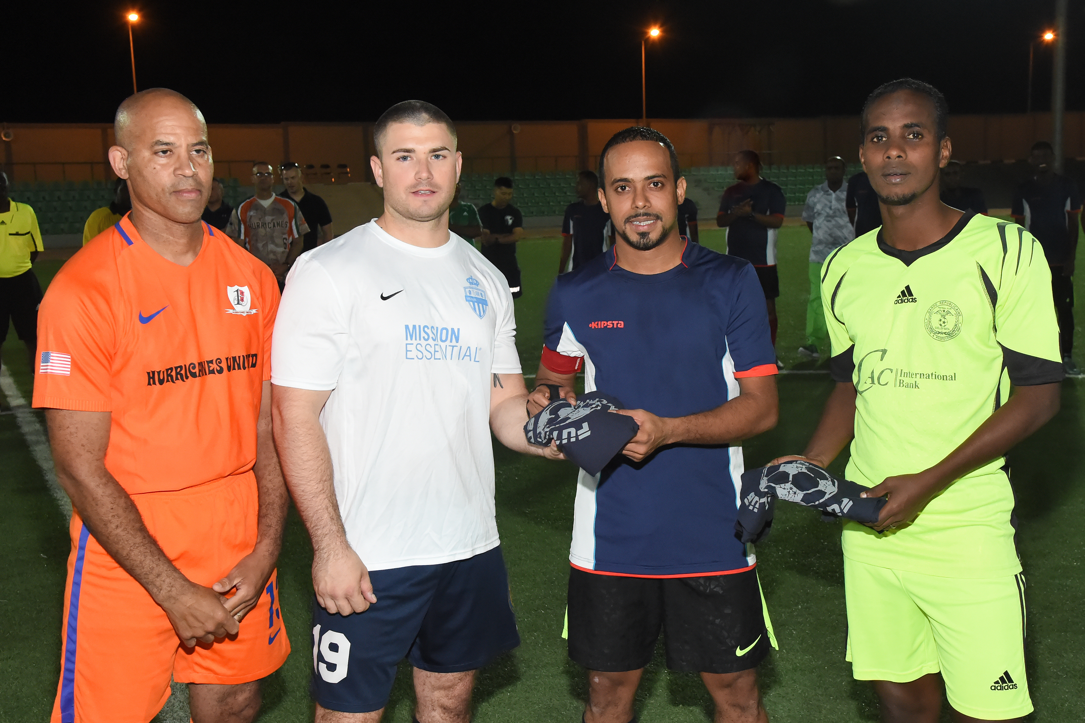 Teams comprised of U.S. military members stationed at Camp Lemonnier, and members of the Djibouti Armed Forces (FAD) Republican Guard exchange gifts prior to the first in a series of friendly soccer matches at the Balbala Sports Complex in Djibouti City, Jan. 1, 2017. Through the organization of regular sporting events, the U.S. service members strive to strengthen the relationship with their FAD counterparts as well as with partner nation militaries operating in the Horn of Africa. (U.S. Air National Guard photo by Master Sgt. Paul Gorman)