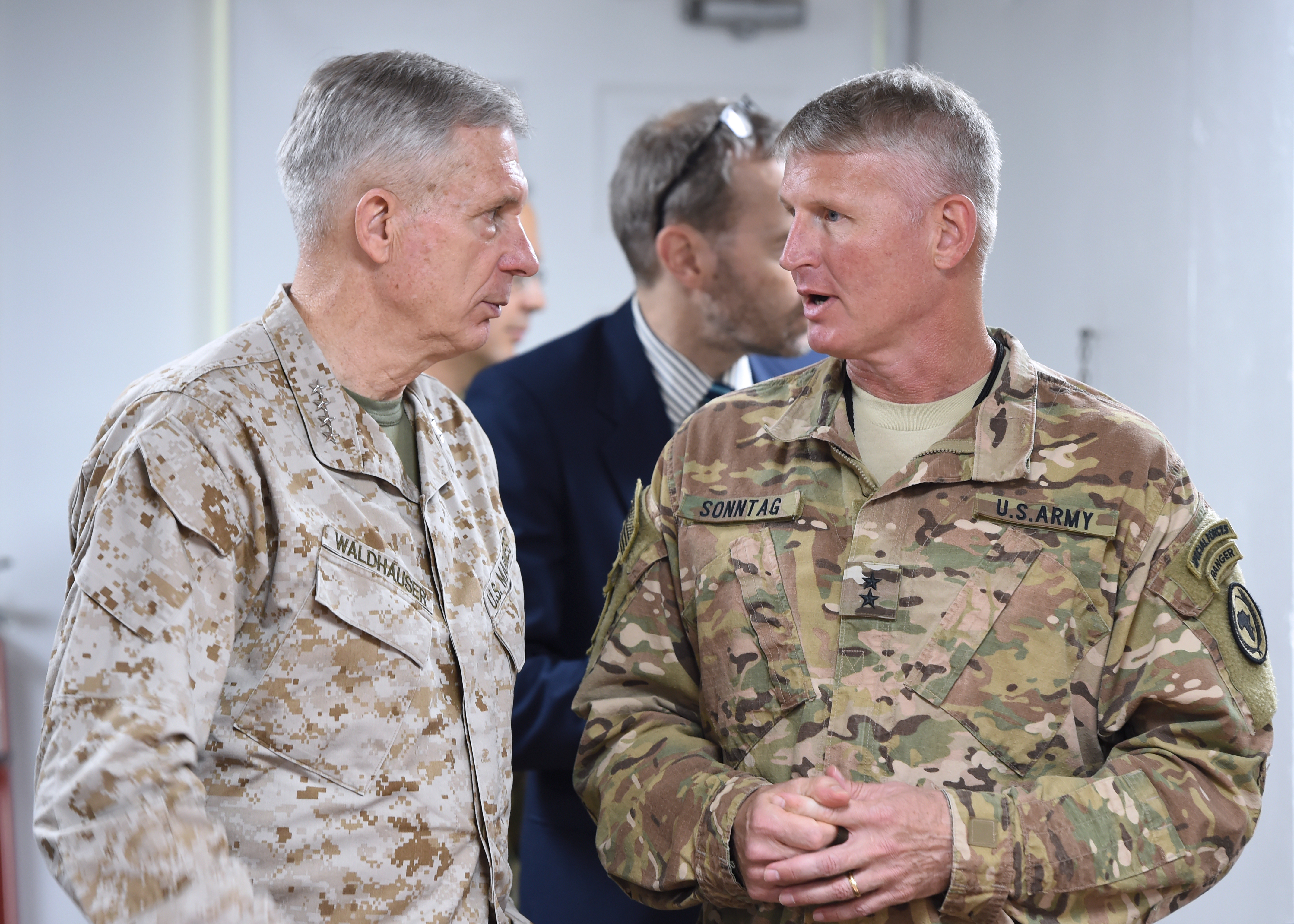 Gen. Thomas Waldhauser, commander of U.S. Africa Command and Combined Joint Task Force-Horn of Africa Commanding General Maj. Gen. Kurt Sonntag converse during the 2017 East Africa Security Synchronization Conference at Camp Lemonnier, Djibouti, Jan. 24. The two-day event allowed U.S. Embassy representatives from eight East African nations to engage with AFRICOM leadership, and provided the opportunity for an open dialogue to discuss the security environments of each country. (U.S. Air National Guard photo by Master Sgt. Paul Gorman)