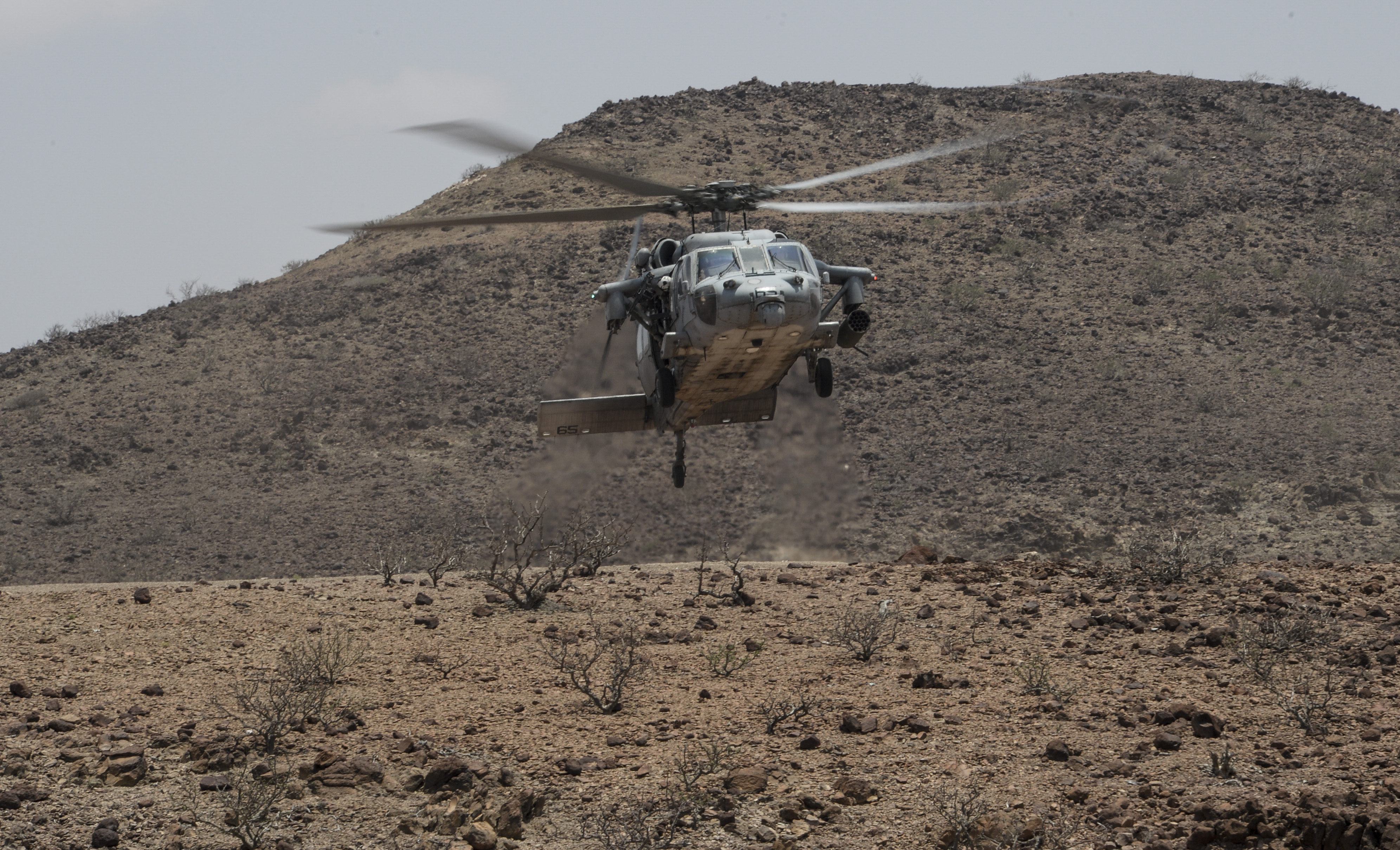 A U.S. Navy SH-60 Seahawk performs a touch-and-go landing during Exercise Alligator Dagger at Arta Range, Djibouti, April 9, 2017. Exercise Alligator Dagger enables the Marines and Sailors to enhance their capabilities and continually support maritime security operations. (U.S. Air National Guard photo by Staff Sgt. Christian Jadot)