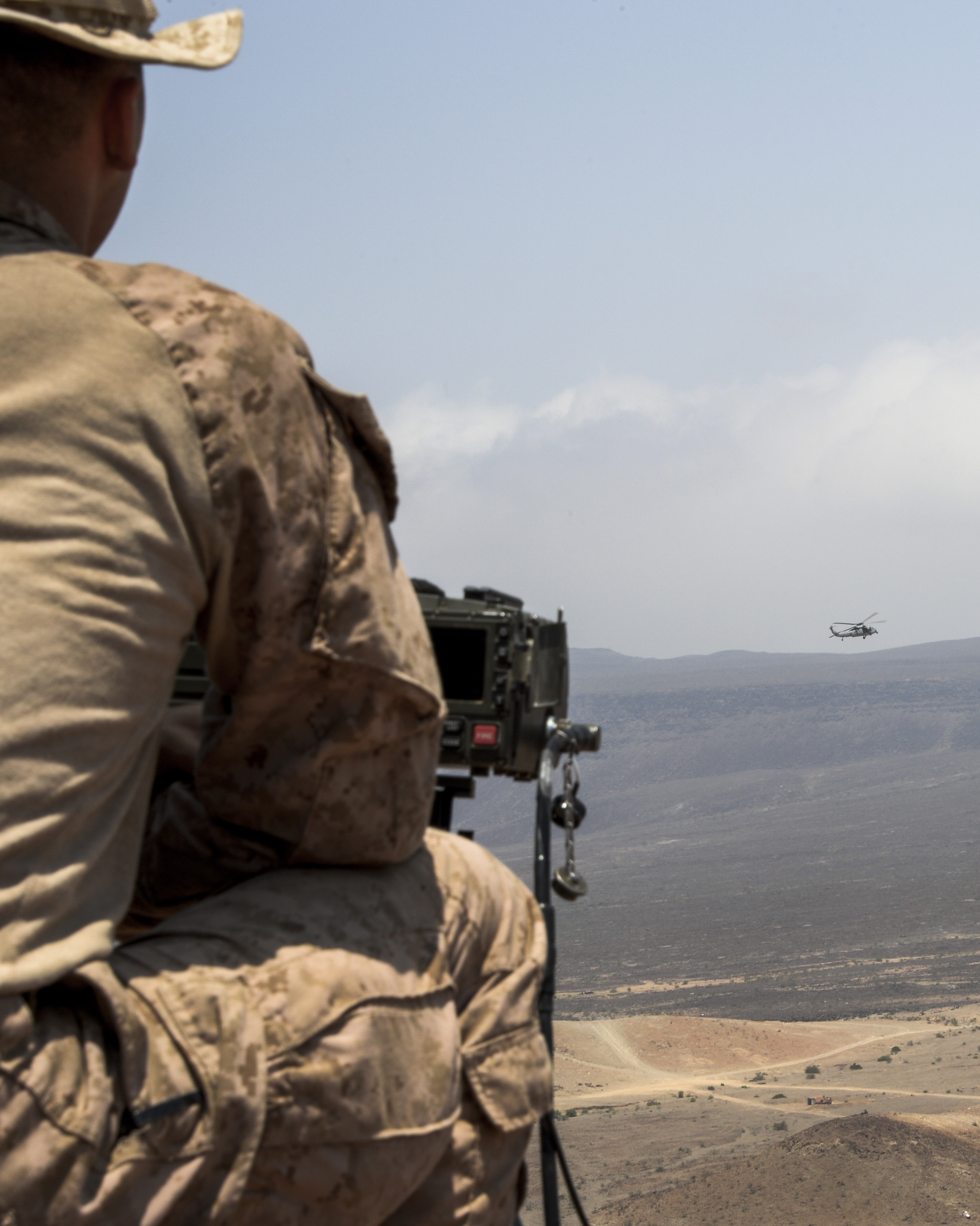 A U.S. Marine, 24th Marine Expeditionary Unit (24th MEU), activates a targeting laser to guide a U.S. Navy SH-60 Seahawk on an attack run during Exercise Alligator Dagger at Arta Plage, Djibouti, April 9, 2017. Alligator Dagger provides a unique opportunity to enhance capabilities in critical mission sets inherent to the U.S. Navy-Marine Corps team. (U.S. Air National Guard photo by Staff Sgt. Christian Jadot)