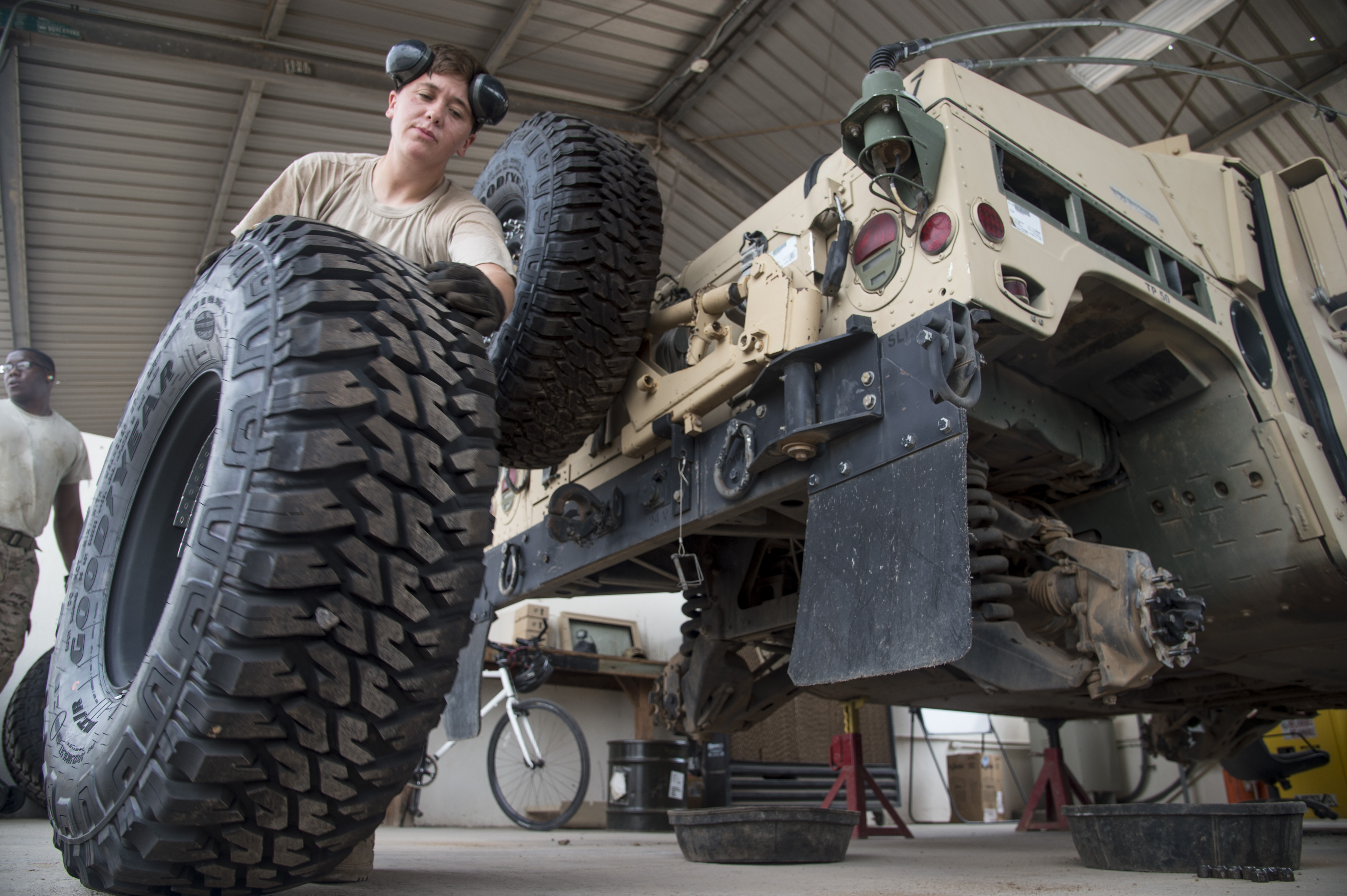U.S. Army Spc. Kelsi May of the 1st Battalion, 153rd Infantry Regiment, deployed with the Combined Joint Task Force-Horn of Africa (CJTF-HOA) in Camp Lemonnier, Djibouti, rolls a tire to be replaced during a biannual service inspection of a Humvee, May 29, 2017. The soldiers maintain vehicles to support efforts in countering regional violent extremist organizations. (U.S. Air National Guard photo by Tech. Sgt. Joe Harwood)