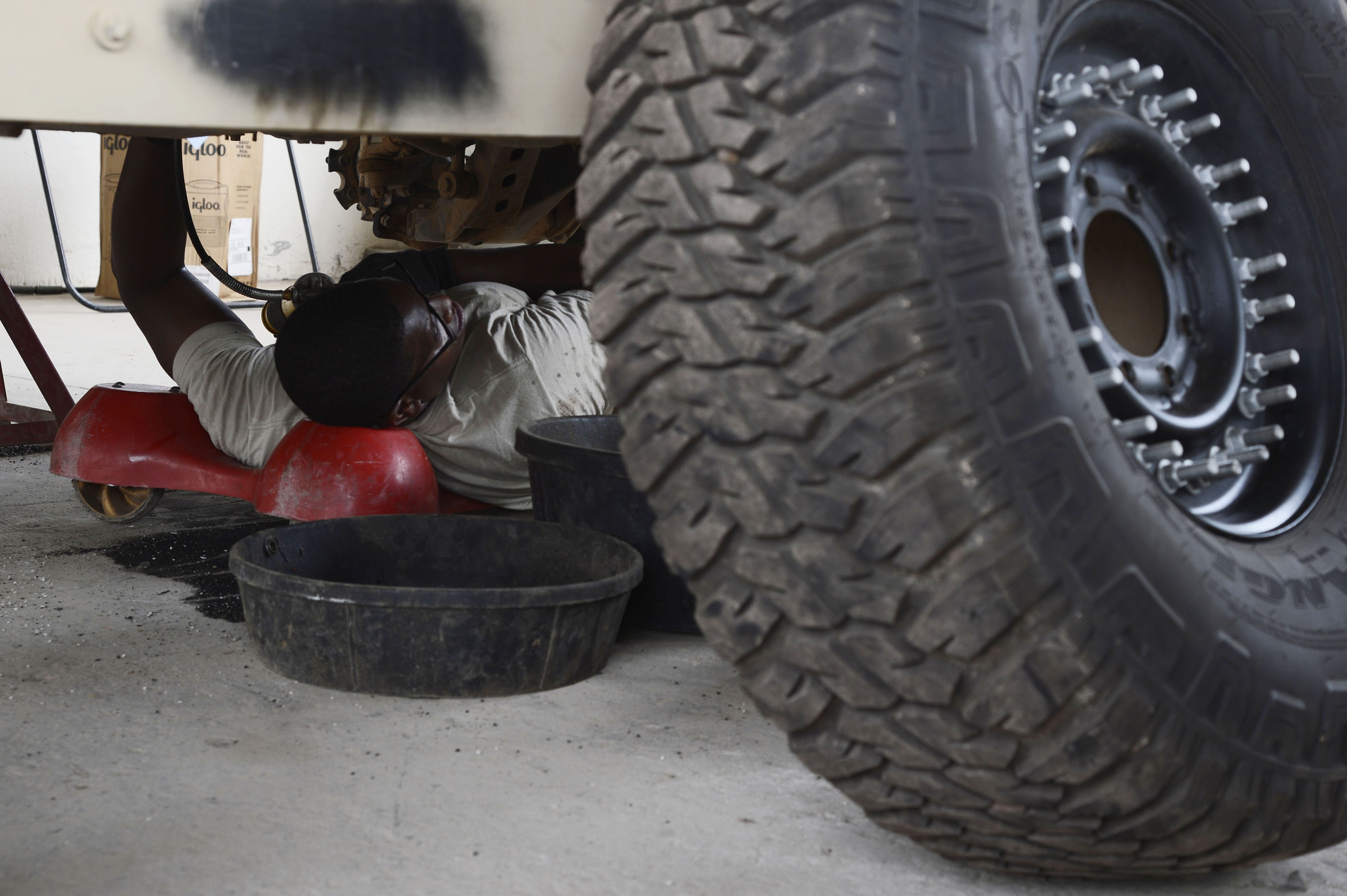 U.S. Army Spc. Christopher Davis of the 1st Battalion, 153rd Infantry Regiment, deployed with Combined Joint Task Force-Horn of Africa (CJTF-HOA) at Camp Lemonnier, Djibouti, checks the undercarriage during a biannual service inspection of a Humvee, May 29, 2017. The soldiers maintain vehicles which support efforts in countering regional violent extremist organizations. (U.S. Air Force photo by Staff Sgt. Lindsay Cryer)