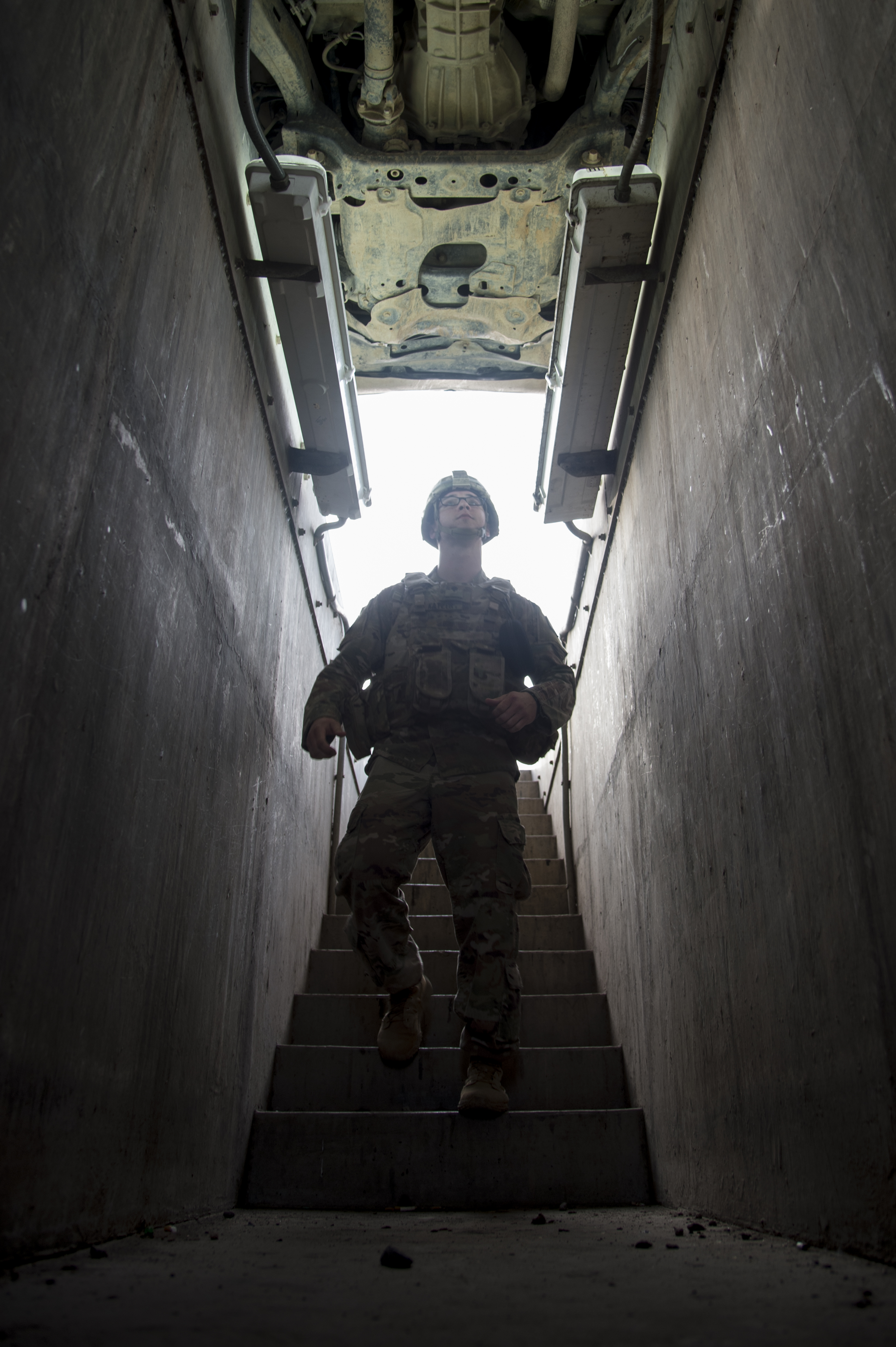 Spc. Austin Katzer,1st Battalion, 153rd Infantry Regiment, deployed with the Combined Joint Task Force-Horn of Africa (CJTF-HOA) in Camp Lemonnier, Djibouti, inspects the undercarriage of a vehicle as part of a random anti-terrorism measure, June 2, 2017. Soldiers of Alpha company secure the installation 24 hours a day and work with Djiboutian contractors to support efforts in countering regional violent extremist organizations. (U.S. Air National Guard photo by Tech. Sgt. Joe Harwood)