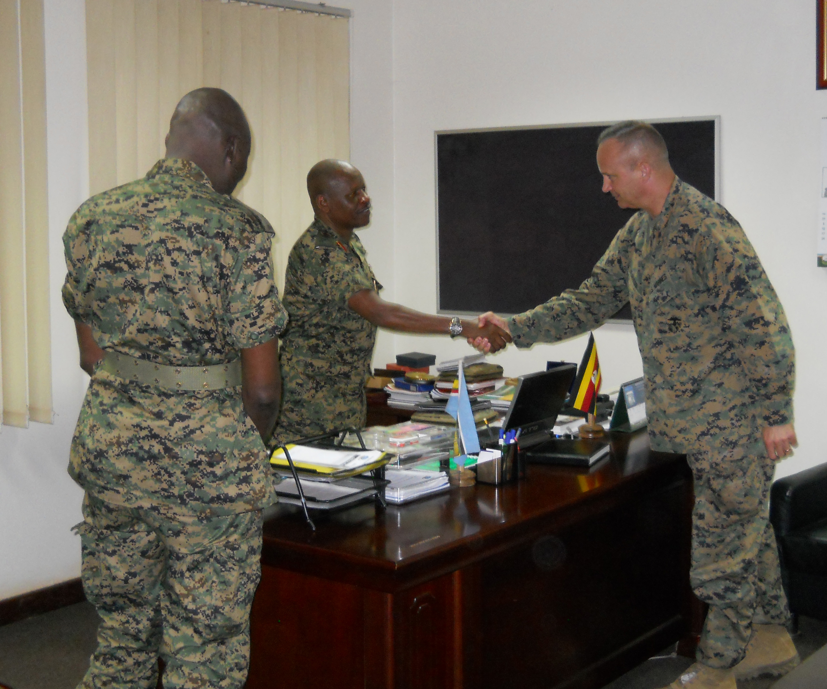 Lt. Gen. Wilson Mbadi, the Deputy Chief of Uganda People’s Defense Force (middle) greets Combined Joint Task Force-Horn of Africa commander U.S. Marine Corps Brig. Gen. David Furness (right) for an office call during a recent visit to an historic UPDF engineering course graduation at the Uganda Rapid Deployment Capability Center, based in Jinja, Uganda. The two military leaders, along with Uganda Rapid Deployment Capability Center commandant Maj. Gen. James Nnkibus Lakara (far left) discussed shared interests, including partnership opportunities for future courses. In the latest iteration of the engineering course, UPDF trainers were advised by U.S. Marine Corps partners from the Special Purpose Marine Air-Ground Task Force-Crisis Response-Africa. (Courtesy photo by Uganda Army Lt. Col. Nelson Aheebwa)