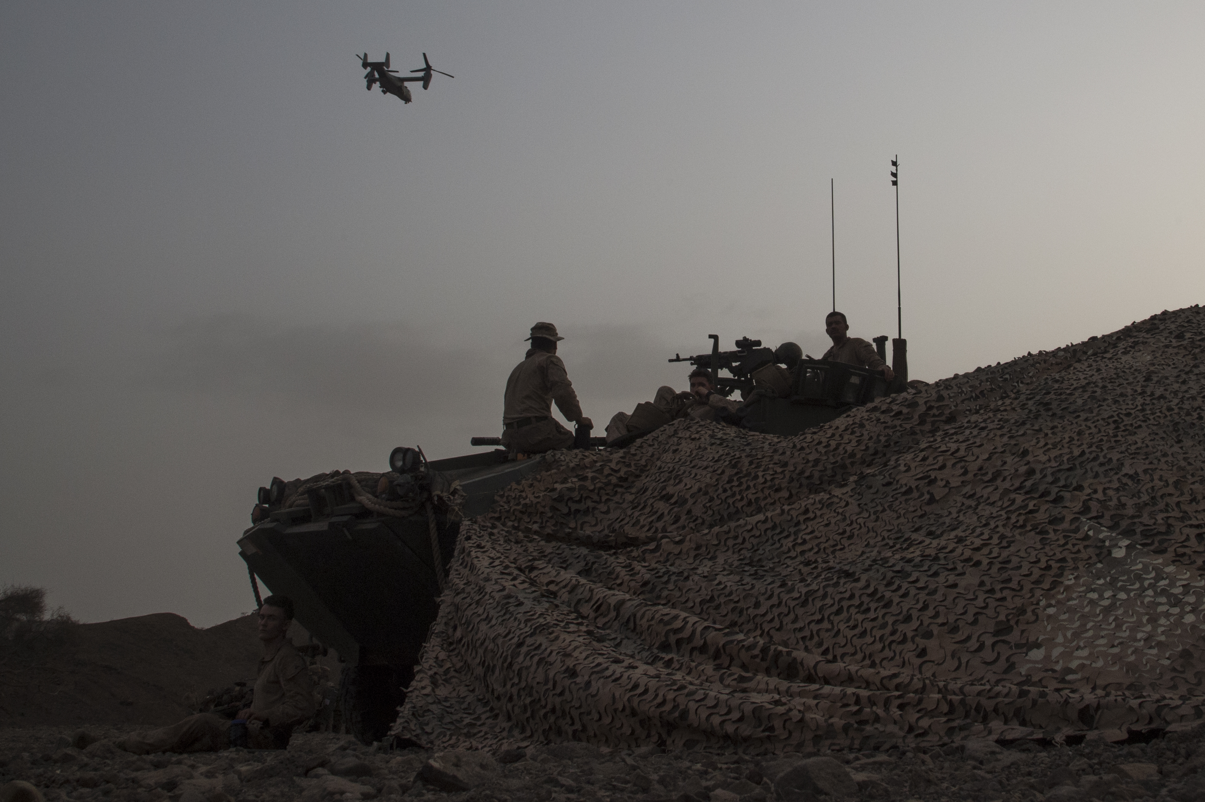 Marines with the 24th Marine Expeditionary Unit in an amphibious assault vehicle watch an MV-22 Osprey fly over during an exercise on the east coast of Africa from the amphibious assault ship USS Bataan (LHD 5) July 9, 2017. Marines with the 24th MEU conduct annual training while deployed with the Bataan Amphibious Ready Group to stay mission ready and maintain Marine Corps standards. Bataan and its ARG are deployed to the U.S. 5th Fleet area of operations in support of maritime security operations designed to reassure allies and partners and preserve the freedom of navigation and the free flow of commerce in the region. (U.S. Air National Guard photo by Tech. Sgt. Joe Harwood)